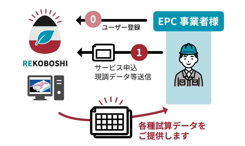 REKOBOSHIが提供する主要サービスは、① 顧客の1年間の電力使用量(デマンドデータ)の取得サービス、② 3Dによる発電シミュレーションサービス、③ 提案書作成サービス となっており、従来2週間以上かかっていた提案作業を最短3営業日で実現するサービスとなっております。