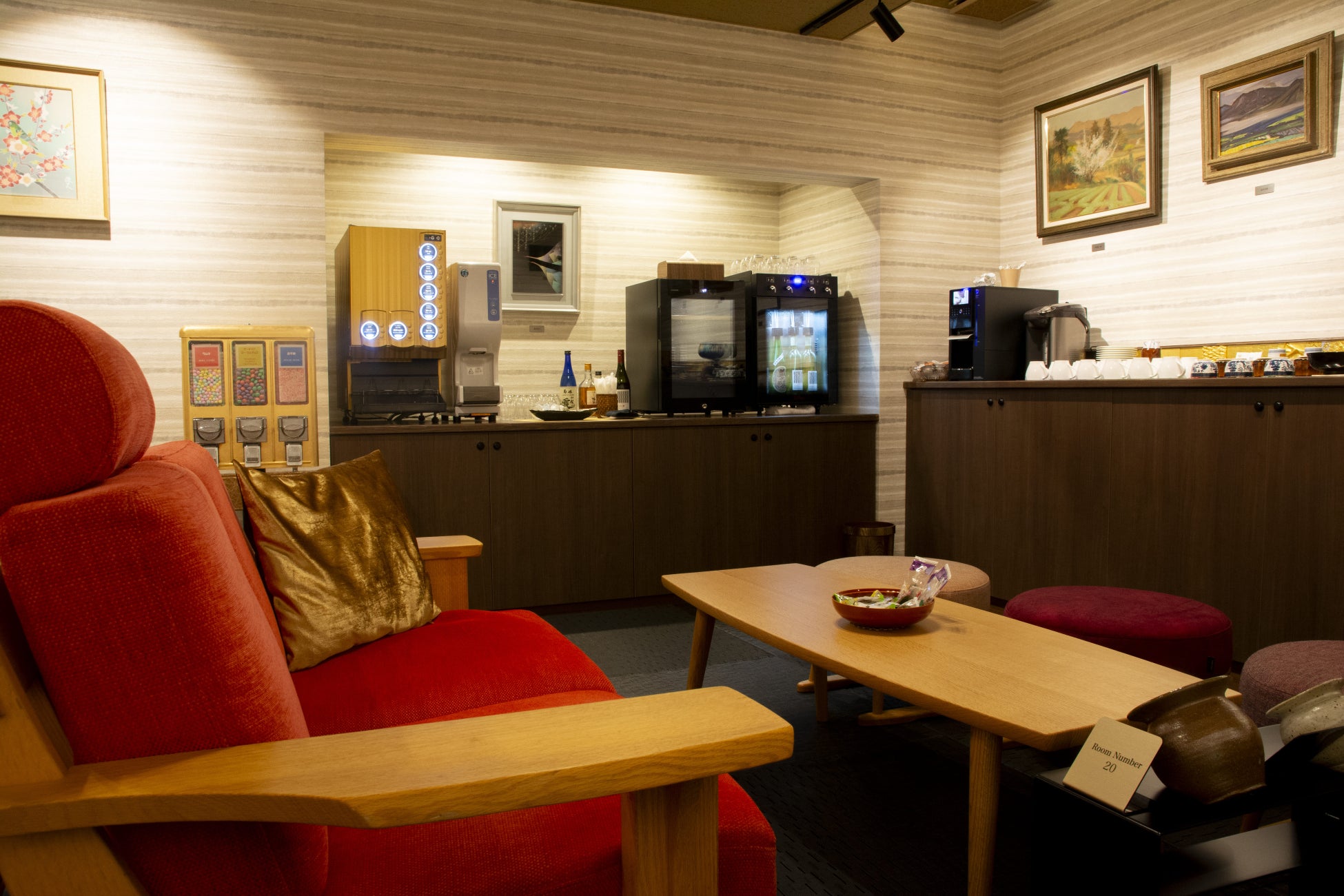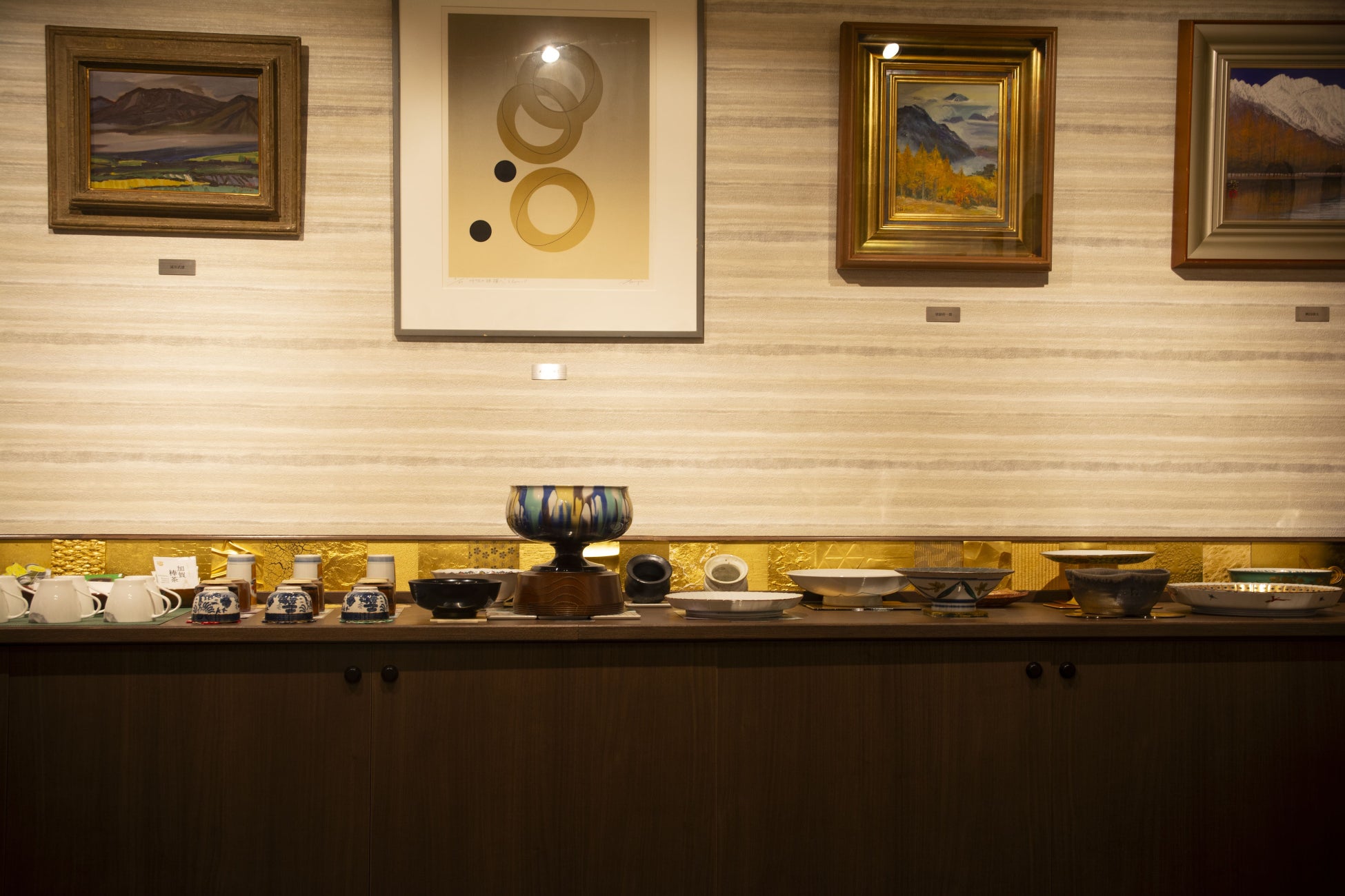 石川が誇る名工による九谷焼、大樋焼、輪島塗など工芸品と石川県出身の画家による絵画を展開するギャラリーラウンジです。地元の金箔メーカー『箔一』が制作した、黄金のスナックディスペンサーを設置しました。