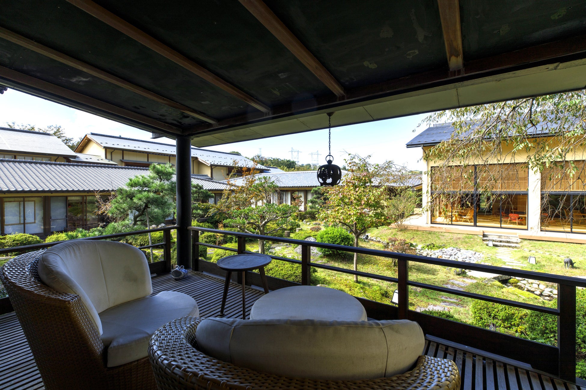 当宿は和風の建築で、母屋が中庭を回り込むように配置され、四季折々の自然を楽しめます。