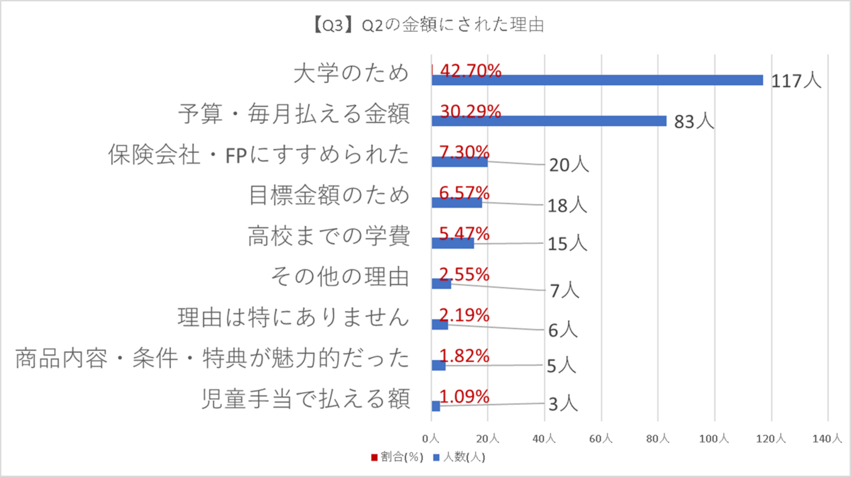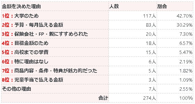 児童手当をそのまま学資保険に充てるという回答もあり、参考になるのではないかと思います。 その他の詳細な理由につきましては、表の下に掲載しています。