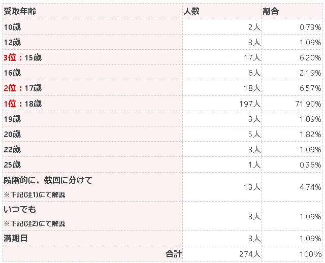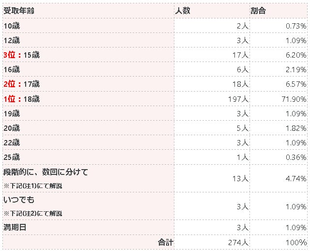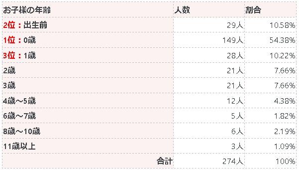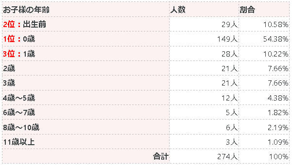 産まれた時(0歳)と答えた方が149人と一番多く、出生前から小学校に入るまでに準備をしておこうという親御さんの気持ちが見えてきます。