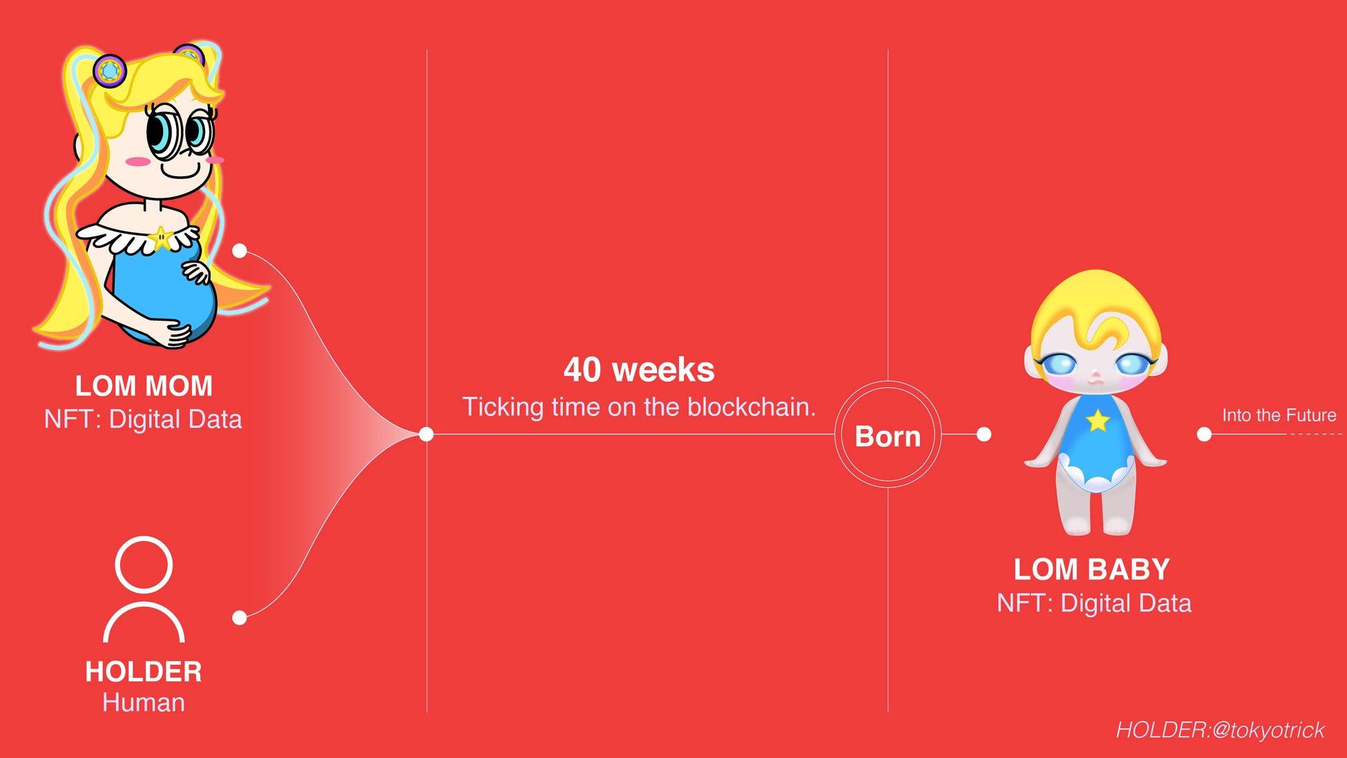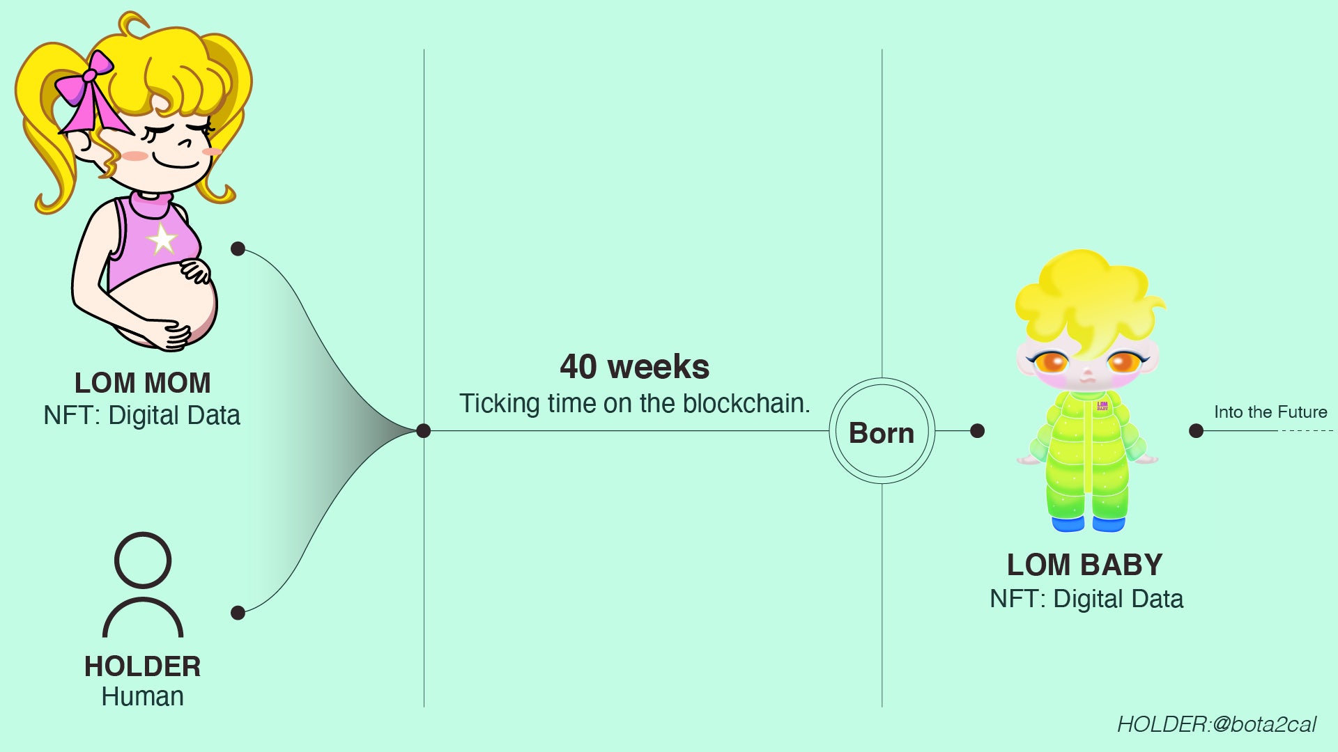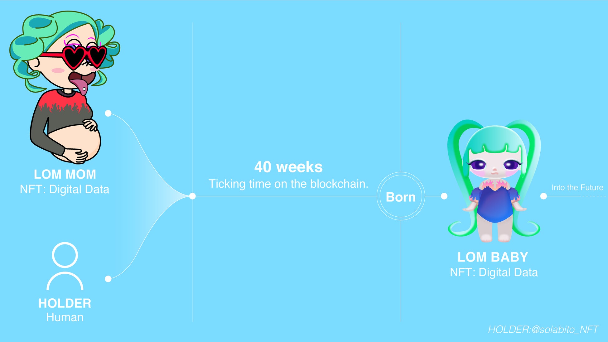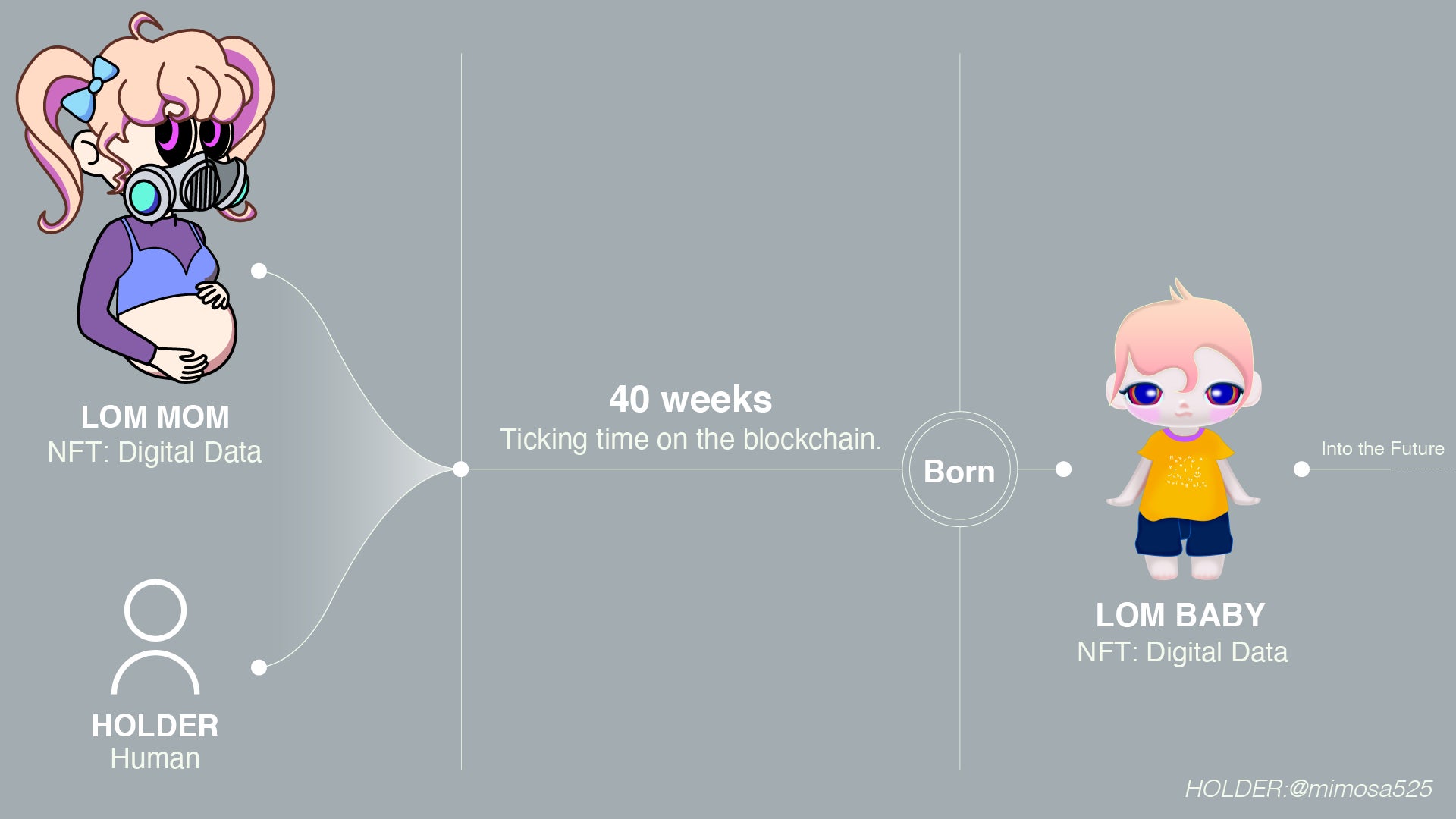 そして、人類がブロックチェーンを通じてMOMとつながることによって、人類の妊娠期間と同じ約40週の時間が経過した後、デジタルデータ上にLOM BABYが誕生します。