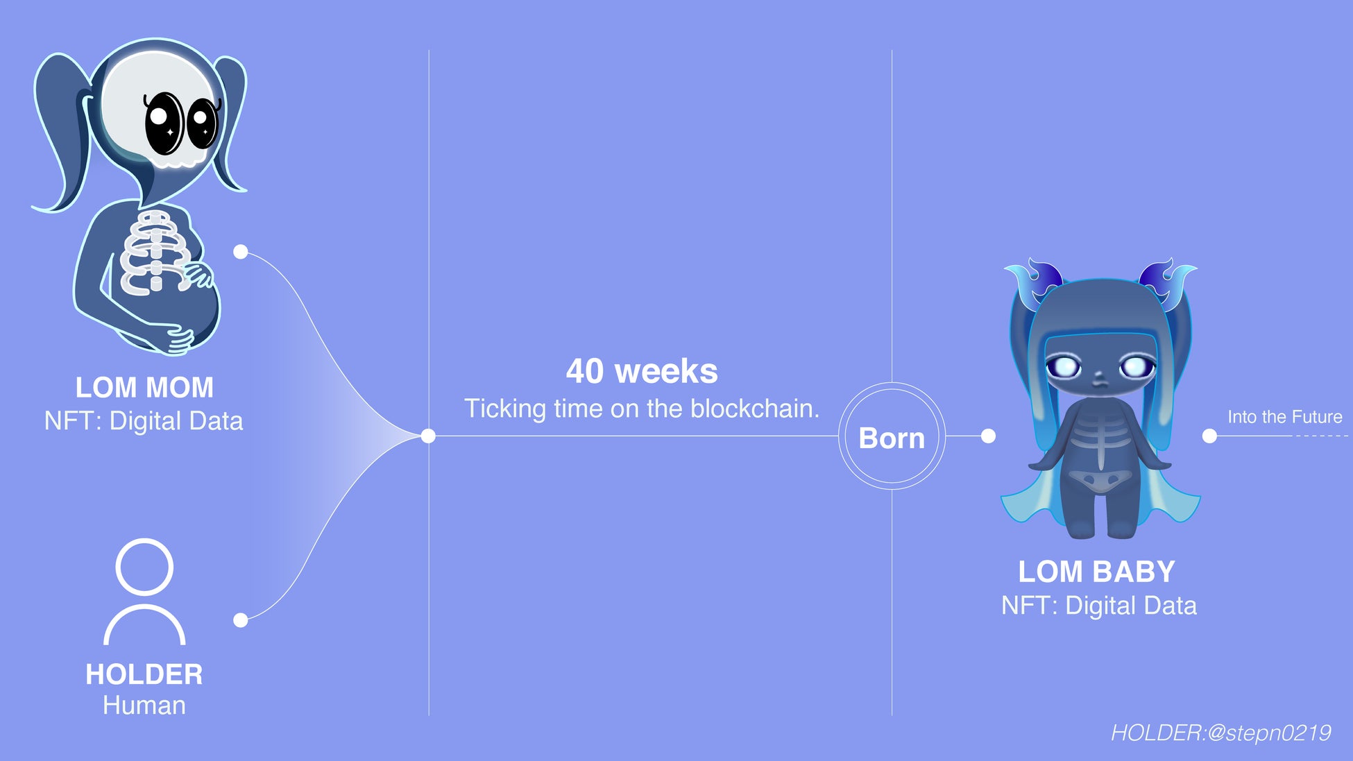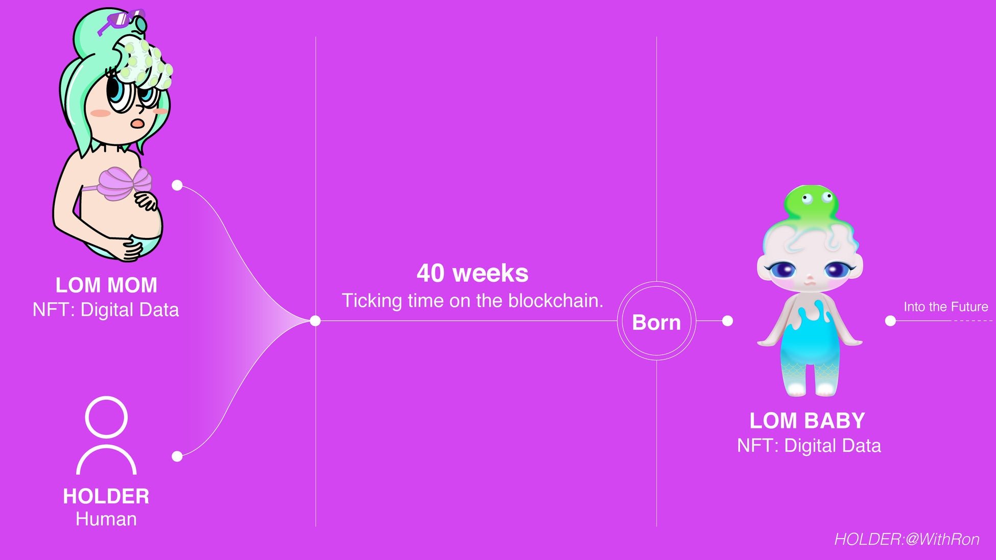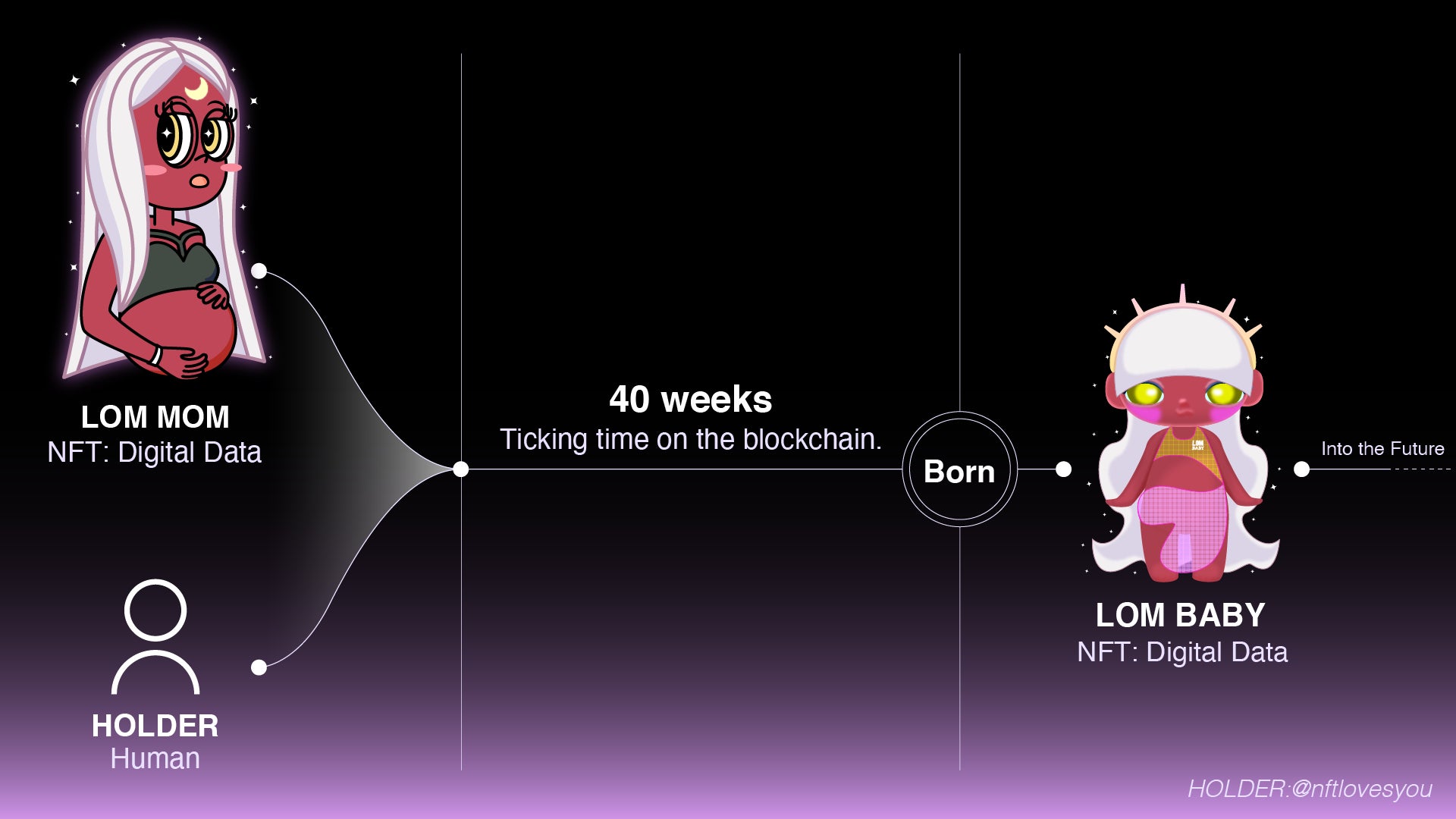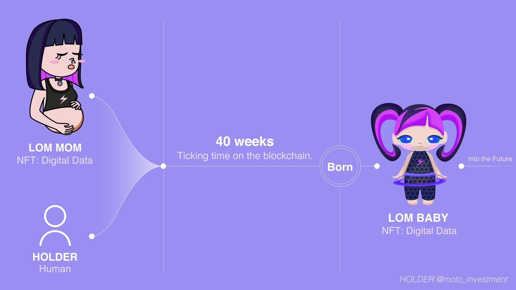 そして、人類がブロックチェーンを通じてMOMとつながることによって、人類の妊娠期間と同じ約40週の時間が経過した後、デジタルデータ上にLOM BABYが誕生します。
