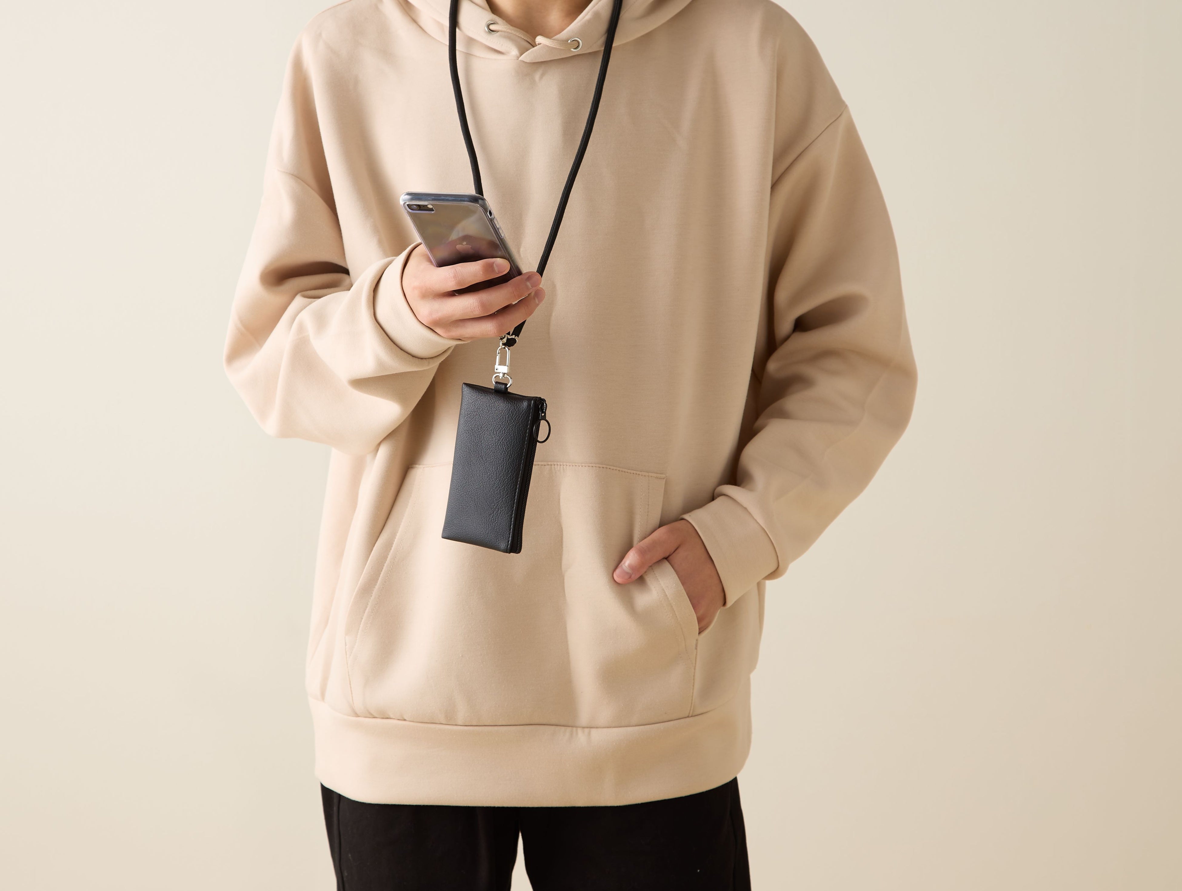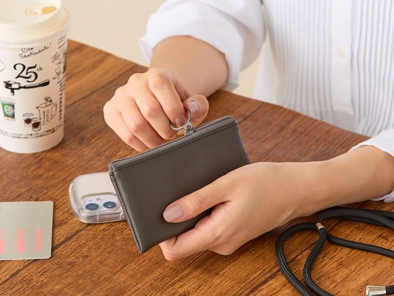 そんな「最低限をスマートに持ち歩くスタイル」を叶えるべく、スマホのショルダーストラップに付けても邪魔にならないミニポーチを開発しました。