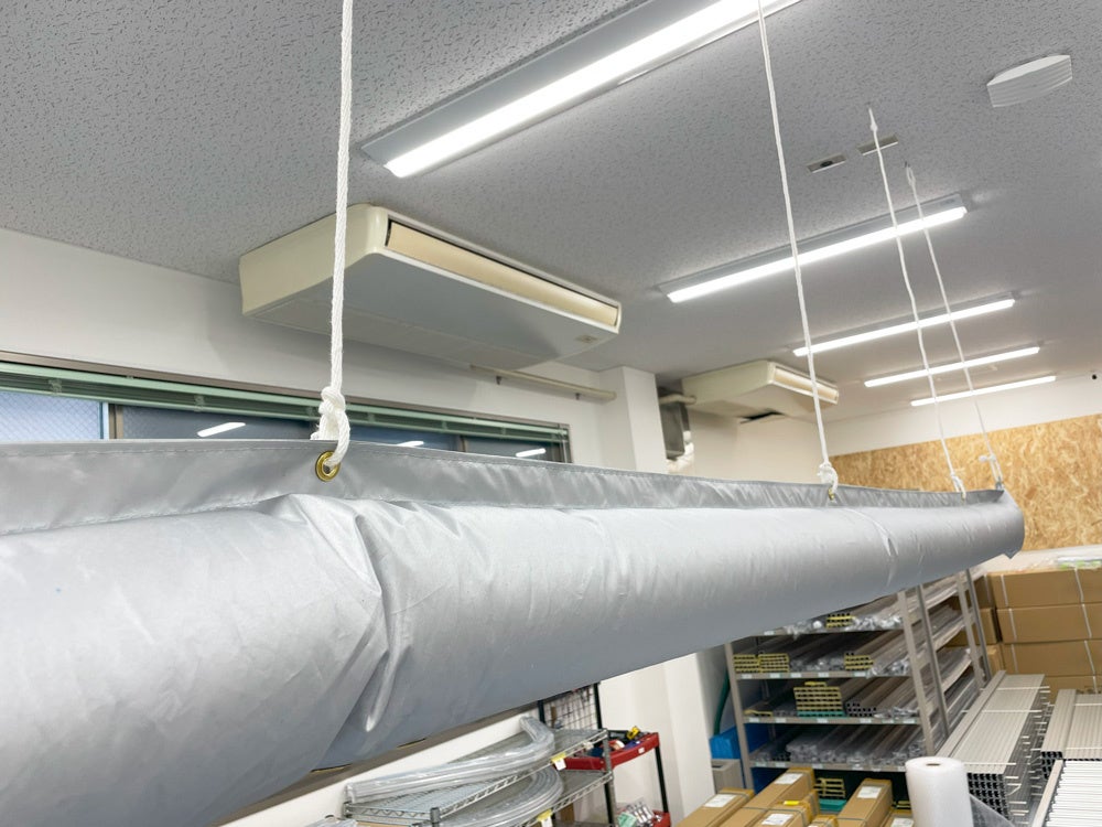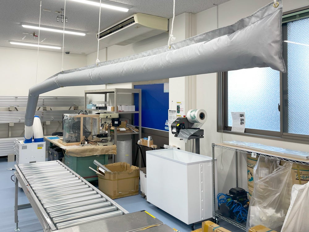 この「冷風シェアダクト」は工場や倉庫などで使用する業務用スポットクーラーに装着することで、冷やしたい場所に効率的に冷風を届けることができます。限られた冷房機器を有効活用できるほか省エネにも貢献できます。
