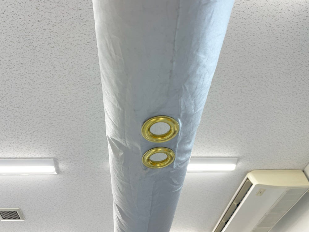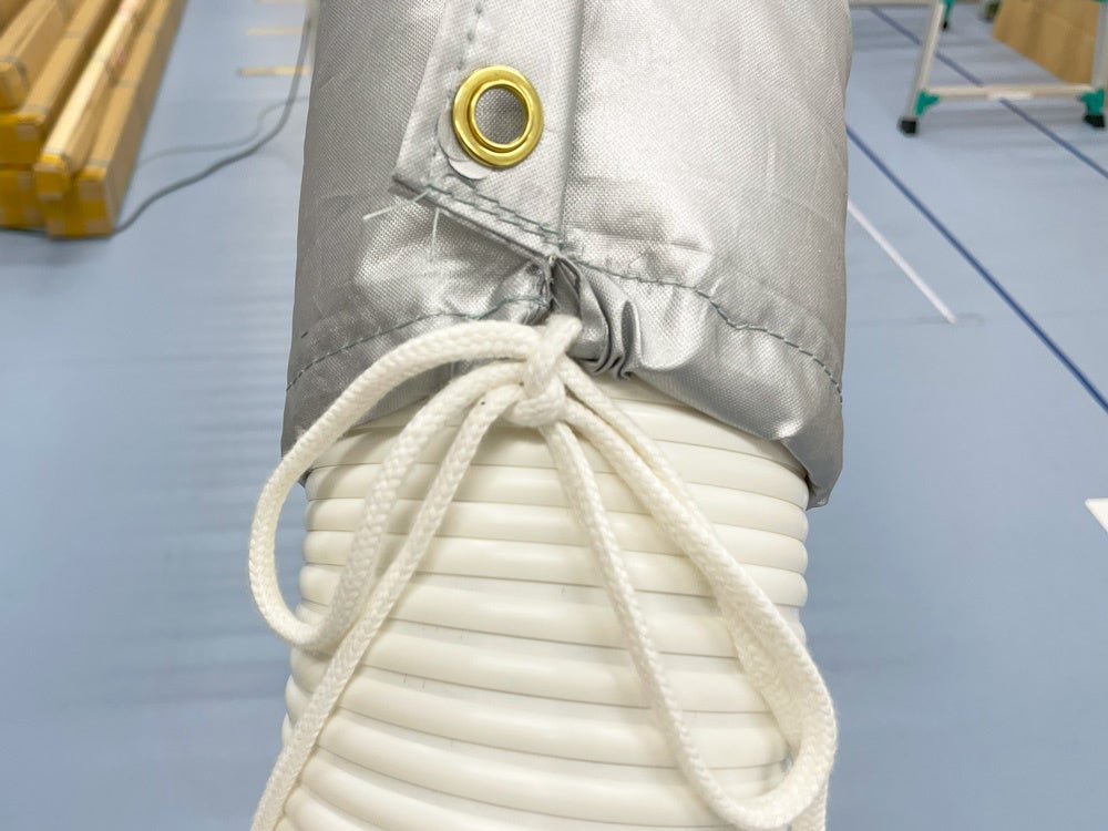 取付けは簡単、スポットクーラーの送風ノズルにひもでとめるだけ。あとは天井から任意の高さに吊り下げればOK。面倒な工事や取付けは必要ありません。