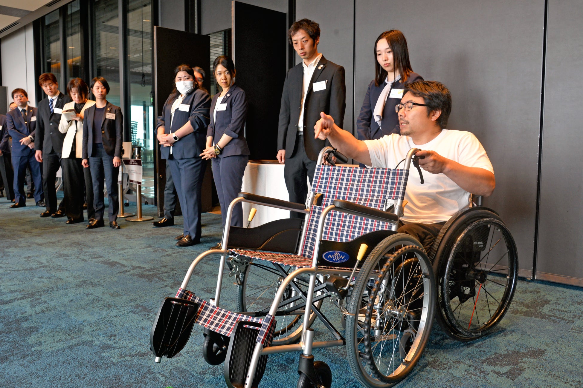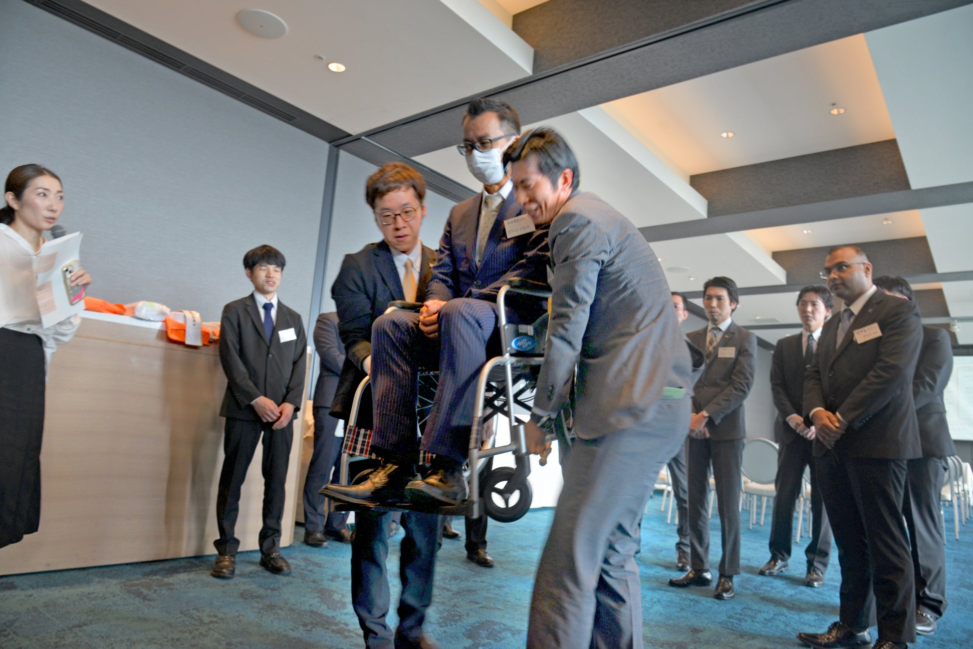 ・避難誘導サポート:災害発生を想定し、車いすでの安全な移動と段差・階段対応を実践。