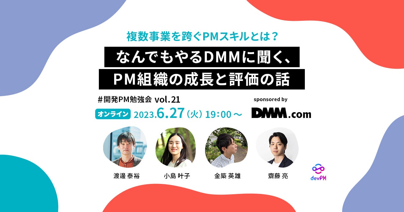 2023年6月27日(火)に開催する21回目の開発PM勉強会では、「領域問わずなんでもやる」を掲げるDMM.comの協賛により、「多様なプロダクトを横断するPM組織のスキル成長と評価の話」をテーマにしたトークイベントを行います。