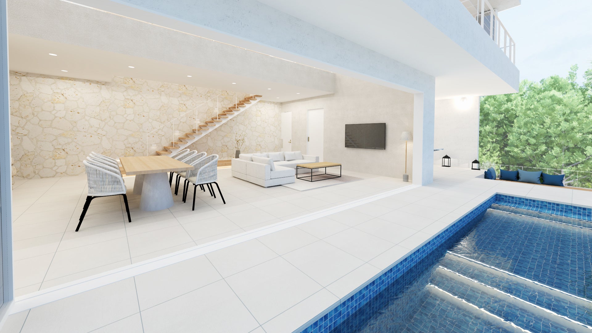 吹き抜けから注ぐ自然光と、大きく開かれた窓があるリビングダイニングは、開放感に満ちた、まるで海辺に佇んでいるかのような錯覚を与える空間になっております。高さ約6mの吹き抜けと約140㎡のインドア・アウトドアリビングで屋内と屋外の境界を超越したリトリート体験をお楽しみいただけます。