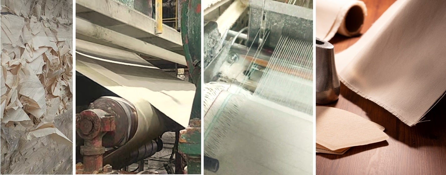 (コーヒーフィルターの廃材を再生古紙にし、糸にして織り上げることで高通気、高強度のCafetexが産まれる)