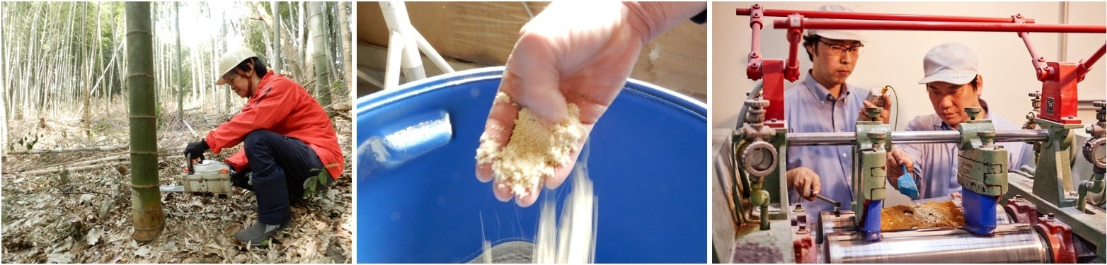 (自治体や山の持ち主から依頼のあった竹林で採取し、パウダーにし、天然ゴムと合成していく)