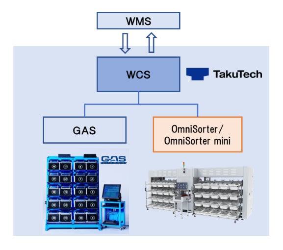 また、タクテックは、ブリッジタウンが提供するオムニ・ソーターを含む他社製品にも対応可能なWCS(倉庫制御システム)を自社開発しており、GASとオムニ・ソーターを組み合わせたハイブリッドな仕分けシステムの構築が可能です。これにより、物流センター全体の効率化とともに、導入費用の最適化も実現いたします。