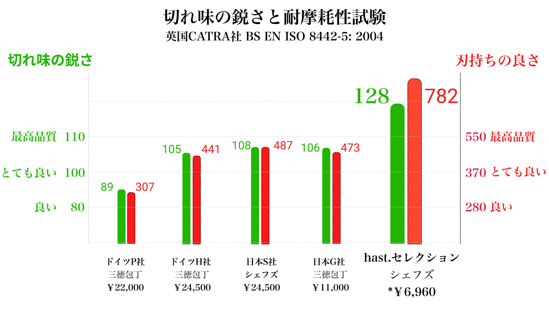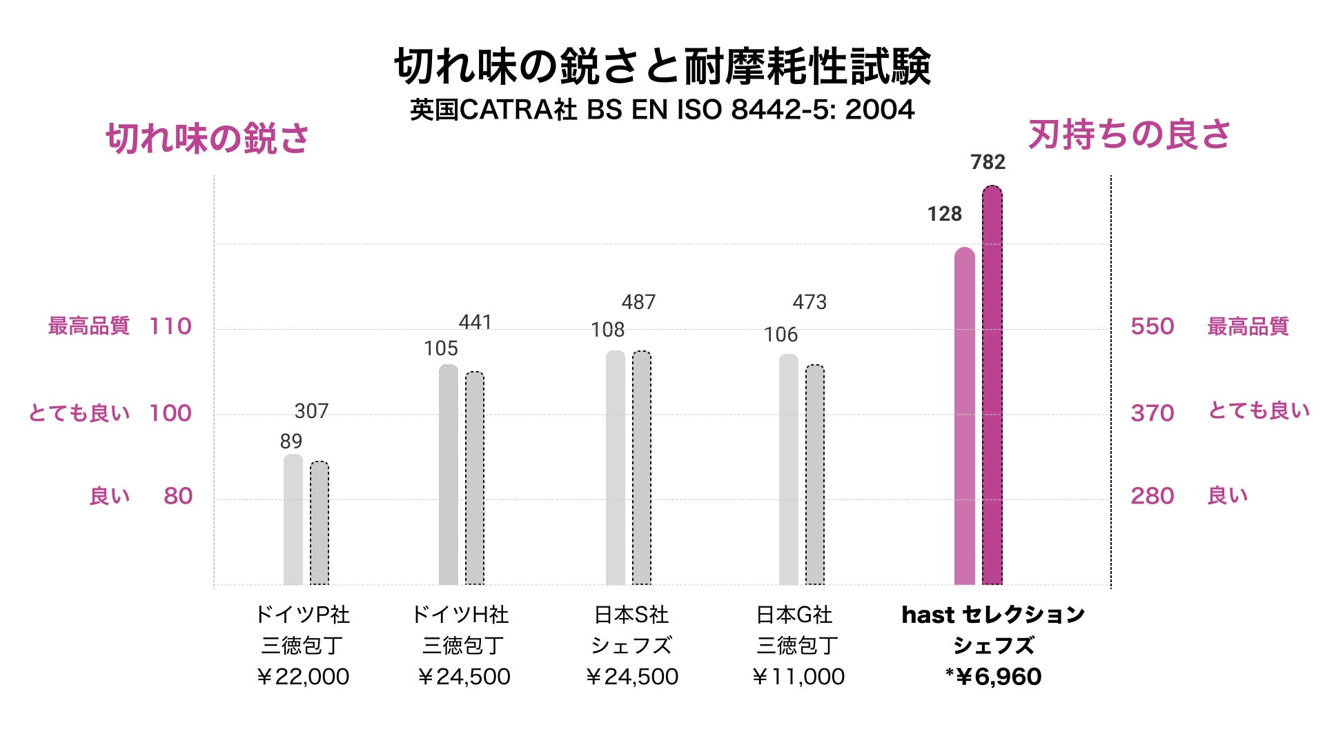 hast.セレクションナイフの切れ味の鋭さと刃持ちの良さが、刃物で有名な多くの高価格帯ブランドナイフよりも優れた結果を記録しています。