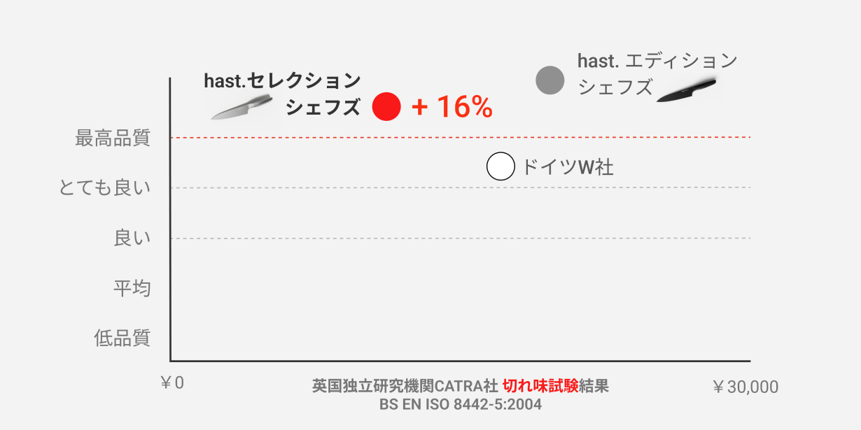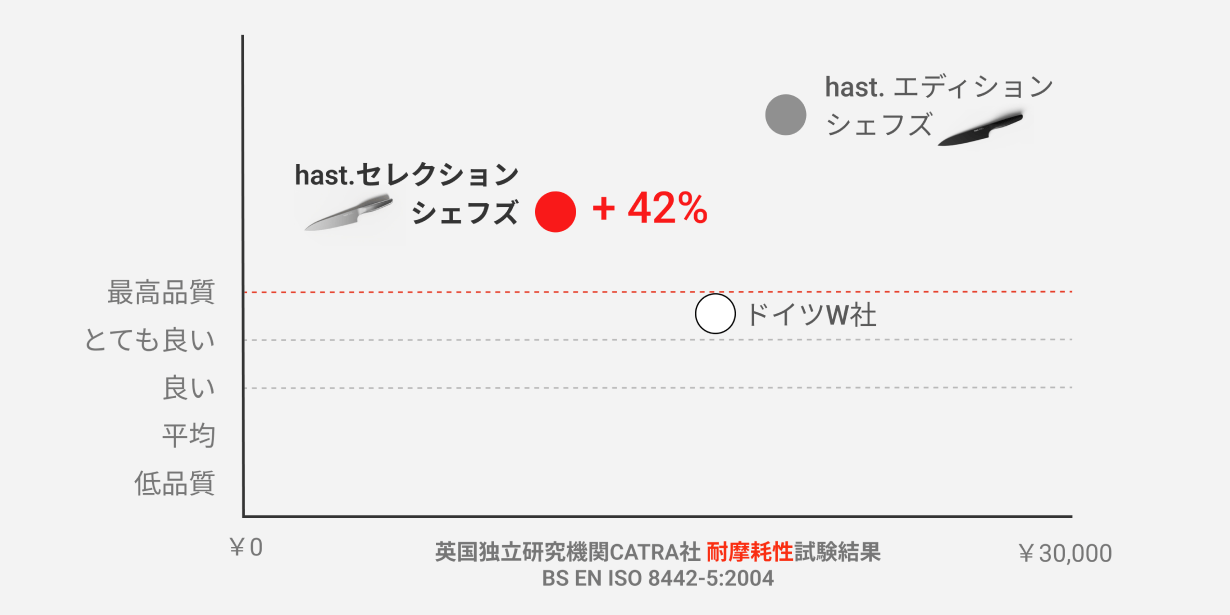 hast.セレクションナイフは、刃物を専門に取り扱う英国独立研究機関CATRA社が実施する切れ味の鋭さを計測する試験で、最高評価基準である [Excellent] を16%超える結果を記録しました。また、切れ味の持続性の計測と評価においても最高評価基準である [Excellent] を42%も上回る結果を記録しました。