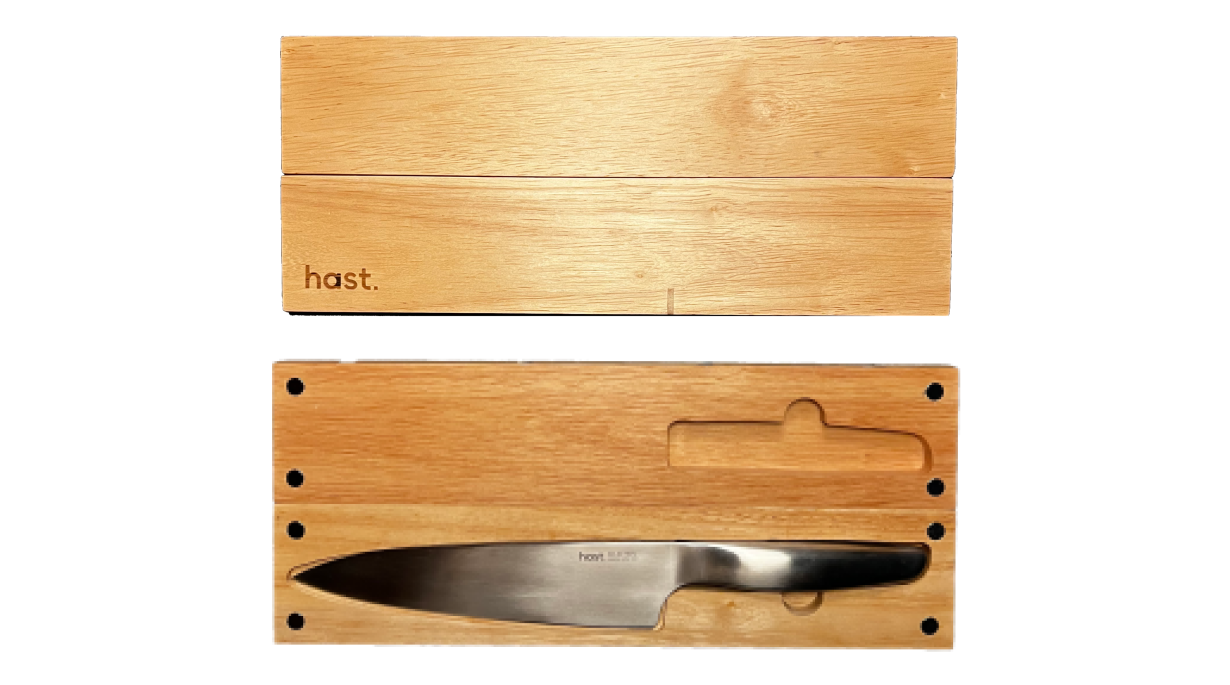 数々の国際的デザインアワードを受賞したhast.エディションナイフ(2020年発売)のデザインを進化させ、日本のプレミアムハイカーボンステンレス(高炭素鋼)を使用した、切れ味・刃持ちの良さ・耐久性・靭性・耐食性・そして衛生面やメンテナンスまで、包丁が本来持つべき要素の全てを妥協なく追求したオールステンレスキッチンナイフです。