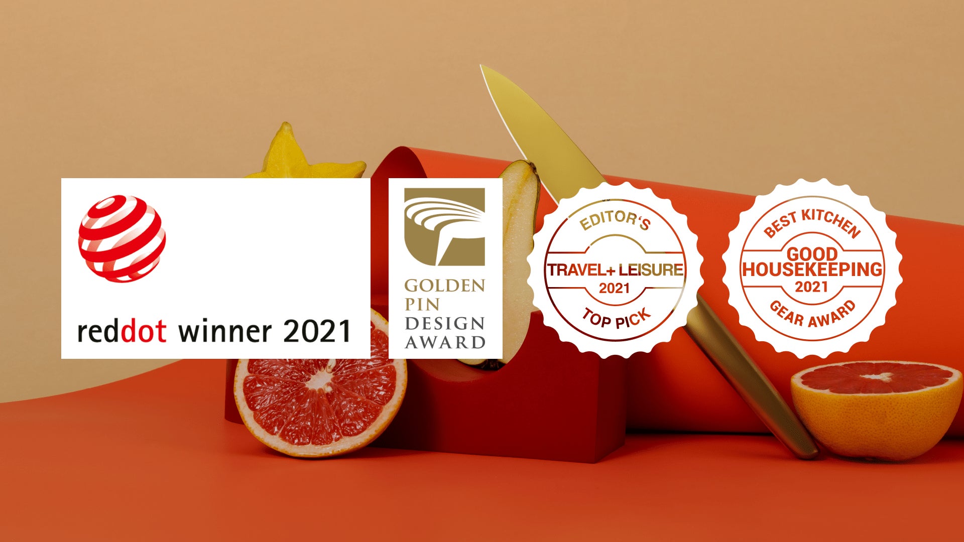 世界3大デザイン賞であるRed Dotデザインや台湾のGoldPinアワードをはじめ、デザインのみではなくクオリティやパフォーマンスが受賞に大きく影響する、ベストキッチンギアアワードをトップスコアで受賞。不良な要素を全て取り払ったミニマルデザインはただ「美しい」だけではなく、ストレスなく料理をするために包丁が必要とする、鋭い切れ味や使い心地の良さを等の「機能性」を最大限まで引き出しています。
