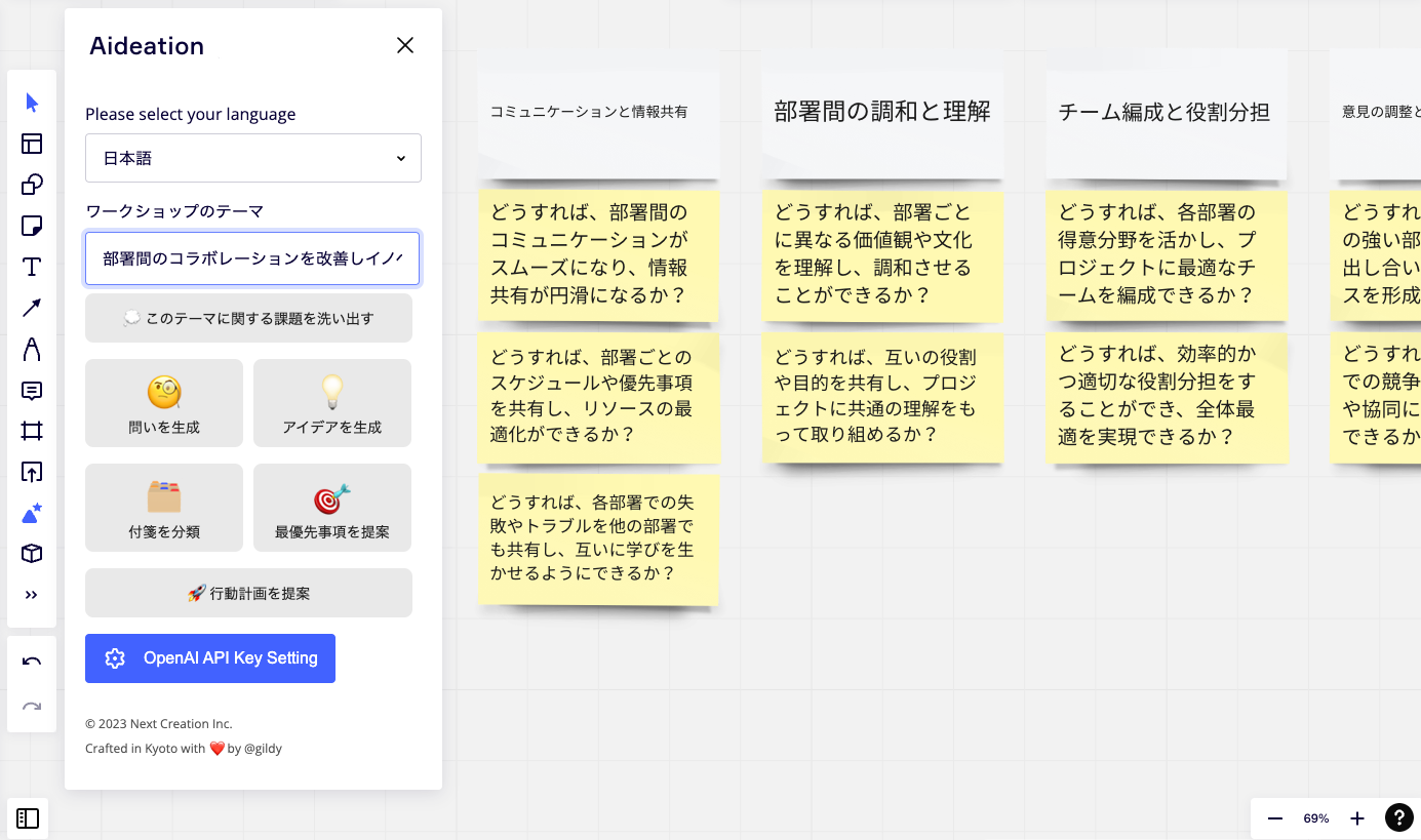 デザインコンサルティング事業を始めて6年目に突入する株式会社ネクストクリエイションが、創業当時から掲げてきた信念は、「どんな人にもクリエイティビティ(=創造性)は備わっていて、それを仕事に生かせばより良い社会を創れる」ということ。そんな働き方のできる社会を実現するために、長引きがちな会議の負担を軽減する手段として、Google発のイノベーション促進手法「デザインスプリント」を広めてきた。2022年にはインドネシア進出も果たした。そして今年は、最新技術のChatGPTの知能を活用したAIツール「Aideation」を開発し、これまでのワークショップをもっと短時間で、より充実した内容に進化させた。