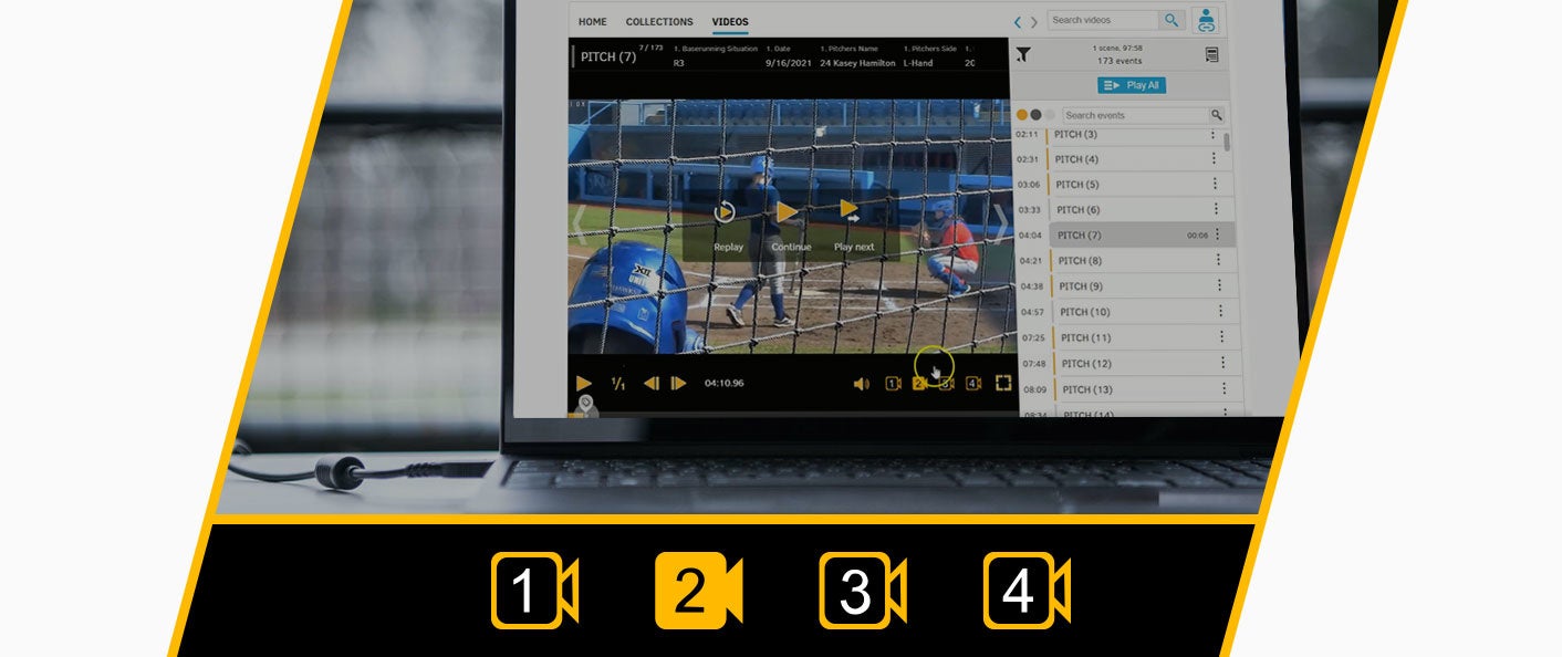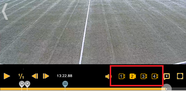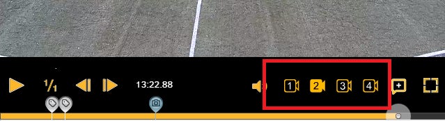 Dartfish.tvへアップロードされたマルチビュー映像にはカメラアイコンが表示され、再生時にいつでも同期された別アングルの映像に1クリックで切り替えることができます。