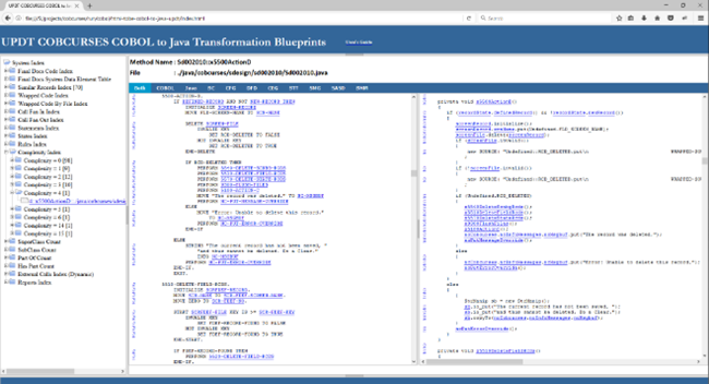 ソースコードの現在の形がHTML化されたドキュメントです。ソースコードとターゲットコードがハイパーリンク化され、チャートやグラフを用いたソースコードの “AS-IS ”ドキュメント(旧システムの実体)を図として表示します。