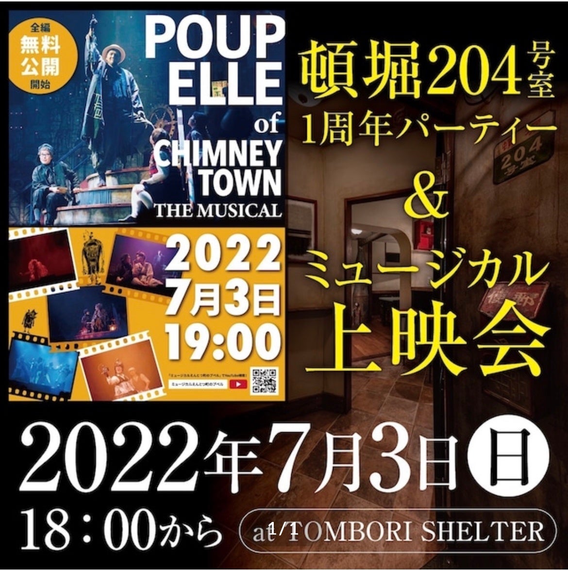 「頓堀宿泊室」「頓堀204号室」のデザインコンセプトの元となっている『えんとつ町のプペル』のファミリーミュージカルがYouTubeにて無料公開されるタイミングと、「頓堀204号室」開業1周年記念が一致したことから、7月3日(日)18時より、「頓堀204号室」同建物の地下にあるレンタルスペース「TOMBORI SHELTER」にて、上映会を実施いたします。