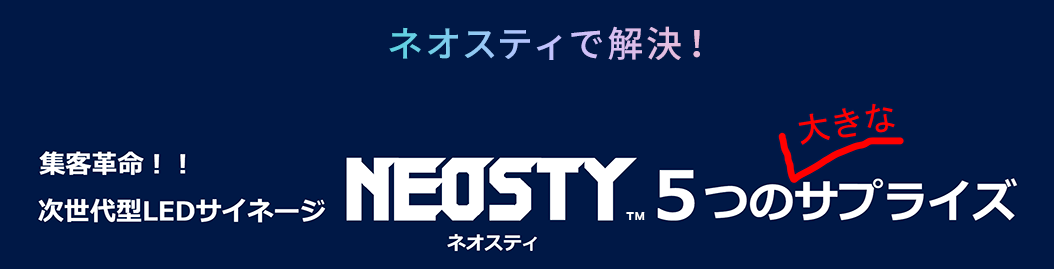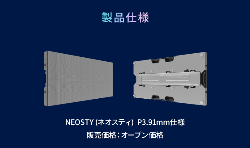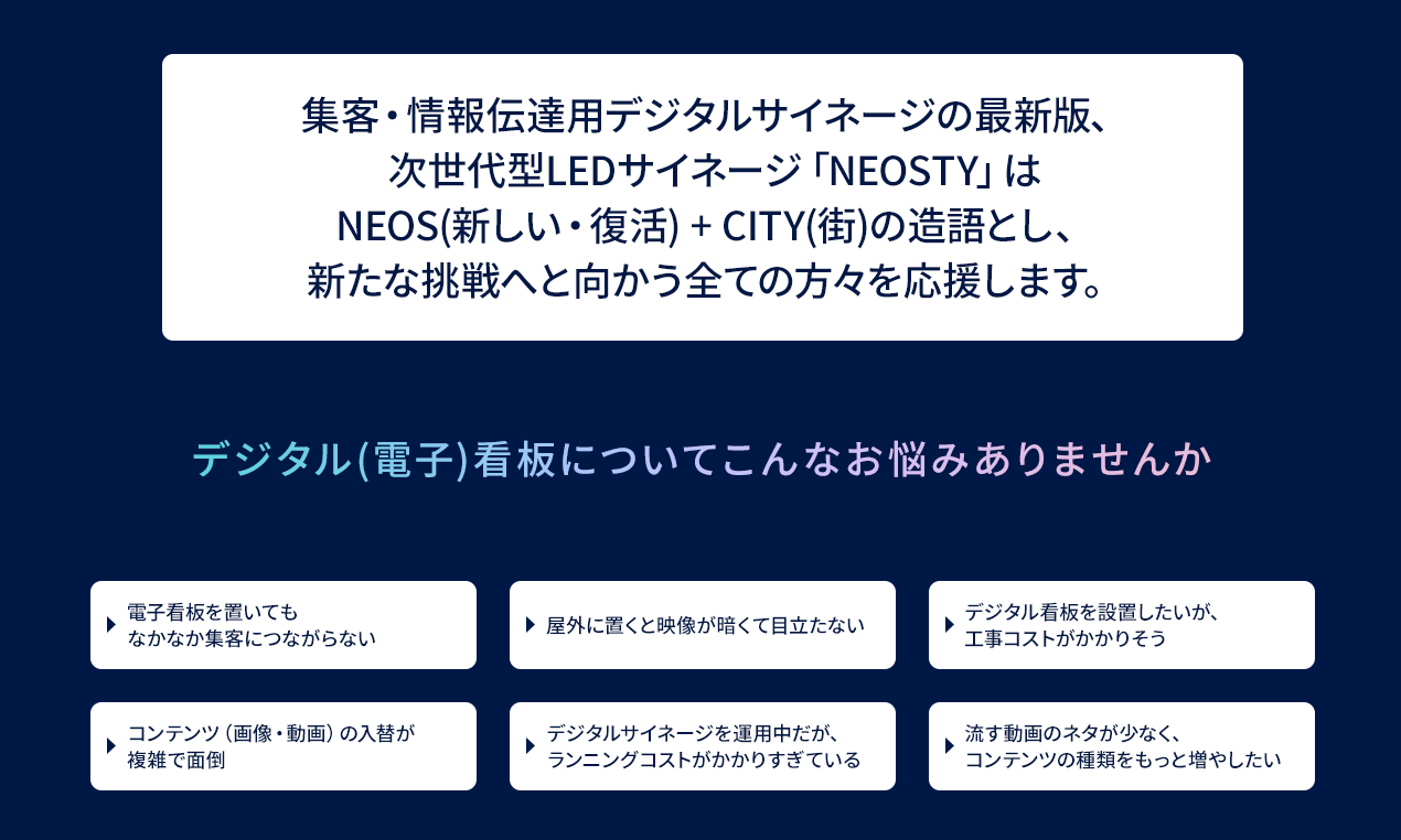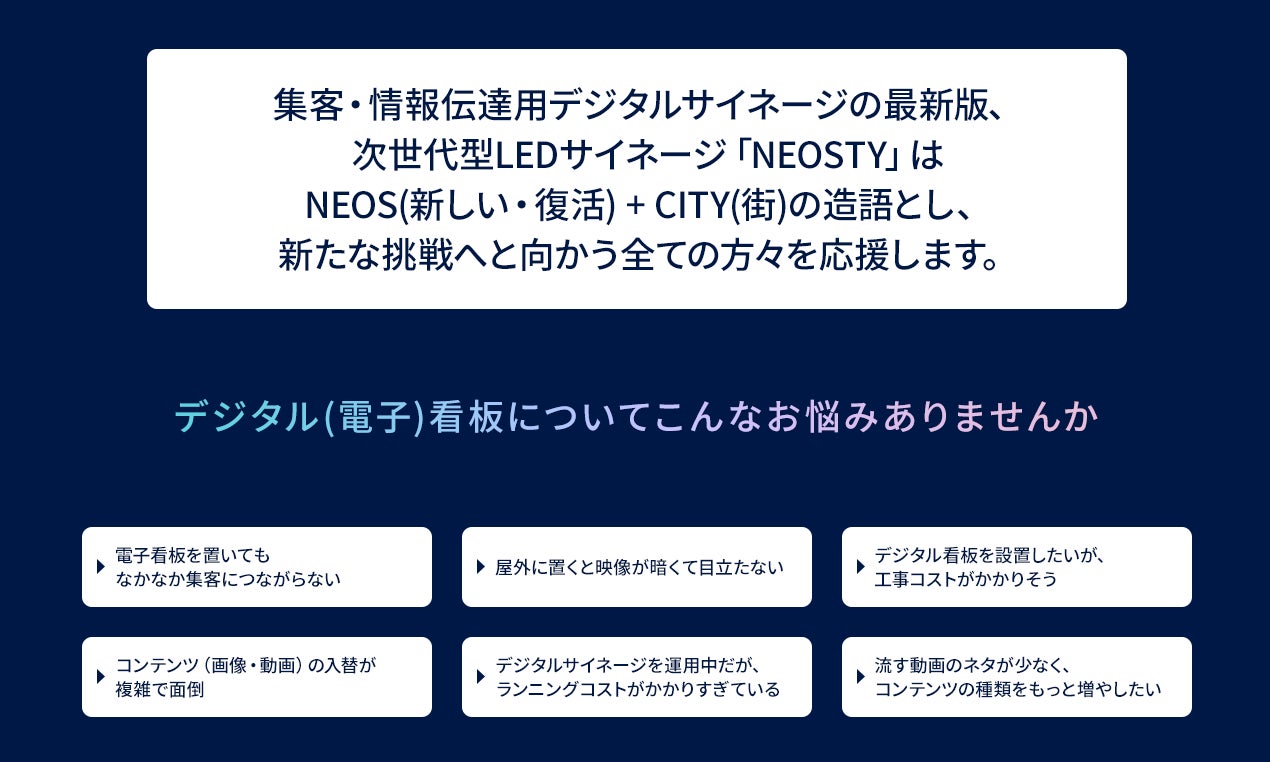 新商品「NEOSTY(ネオスティ)」(NEOS(新しい・復活) + CITY(街) の造語)は、従来の LED サイネージと一線を画した機能・利便性を以て消費者の皆様からの高い要望に確実にお応えできる商品であると自負いたしております。