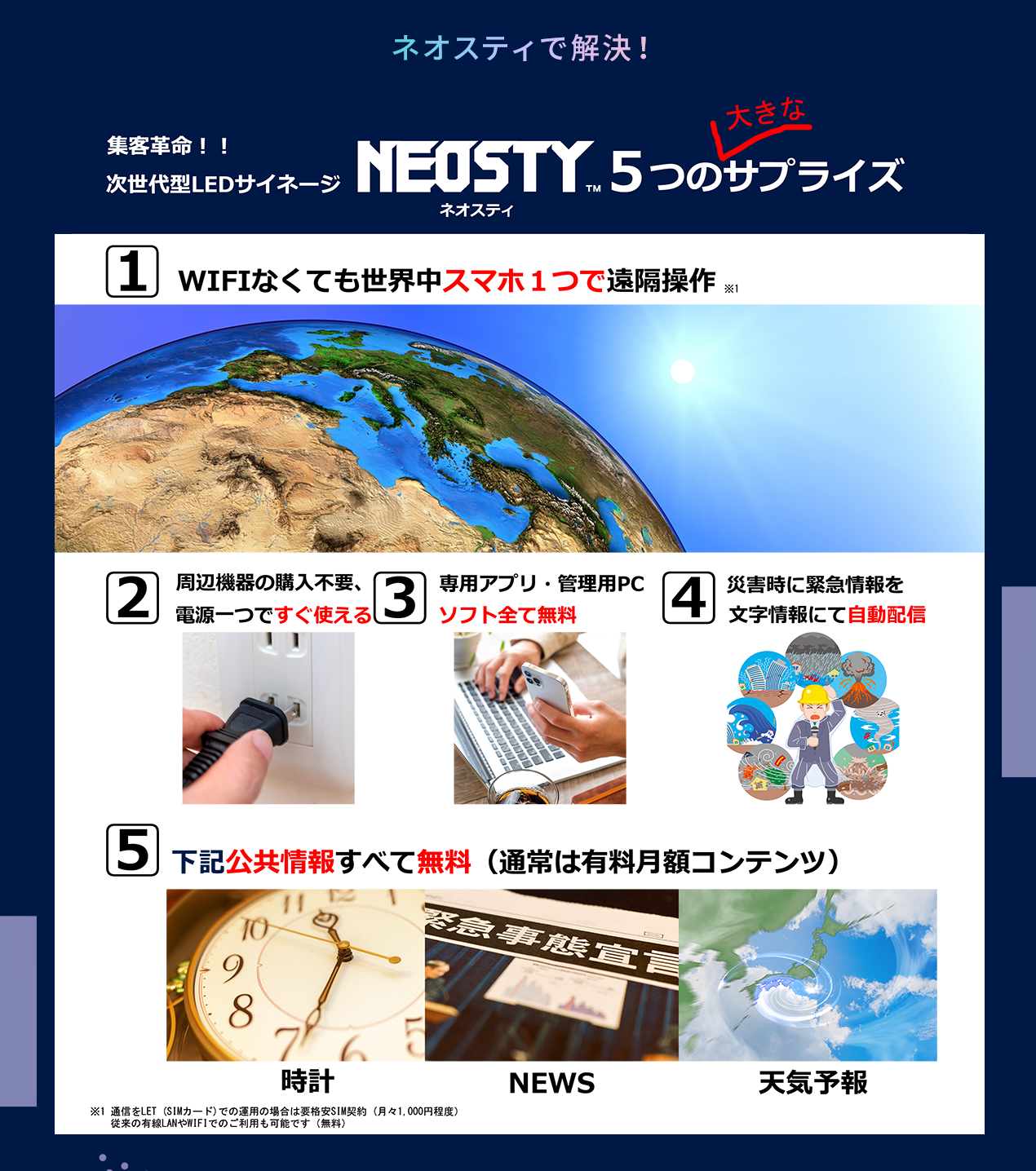 今までのデジタルサイネージでは叶わなかった機能を複数搭載した次世代型LEDサイネージ「NEOSTY (ネオスティ)」はホテル・旅館・民宿などの宿泊施設や飲食・物販・理美容をはじめ、今まで大きな課題の一つであったWIFIなどの通信環境の無い道路や工事現場等の注意喚起などのサインとしてもご活用いただけます。肝心のコンテンツ(画像・動画)配信につきまして、通信環境を問わない接続の安定性に加えて、その簡易さとスピード感はデジタルサイネージに対して生じるお客様からの幅広いご要望を叶えることが出来ると確信しております。