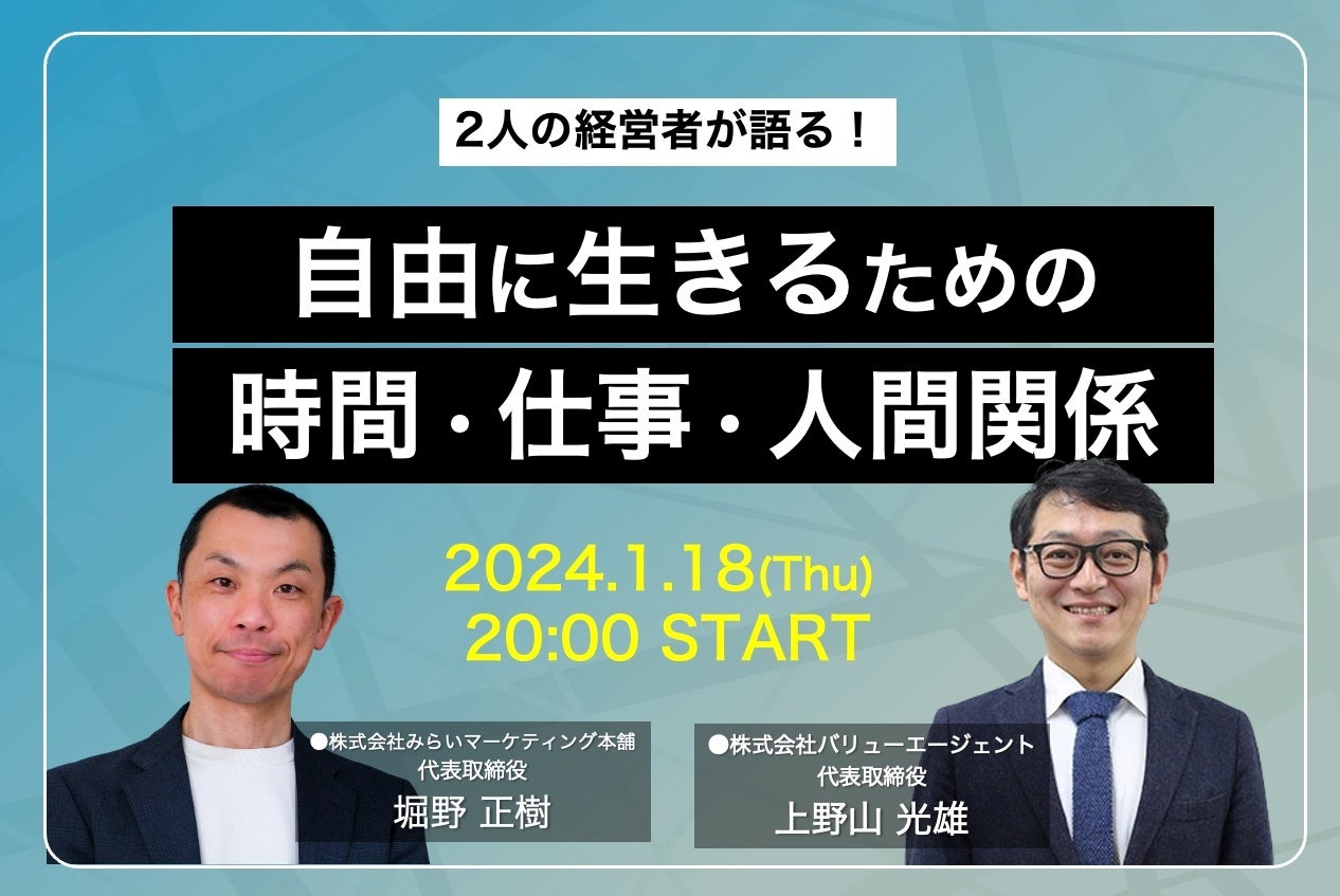 中小企業を対象にしたウェブマーケティングなどを手がけている株式会社バリューエージェントは、1月18日(木)20時から、株式会社みらいマーケティング本舗代表取締役、堀野正樹氏と弊社代表取締役の上野山光雄が「2人の経営者が語る! 自由に生きるための時間・仕事・人間関係」を語りあうトークセッションをXのSapceで開催します。