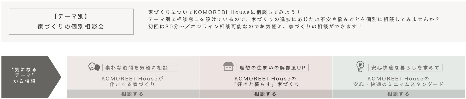 住宅購入者が、お問い合わせを行なった際のコミュニケーションの場を個別相談会として、テーマ別に3つの相談窓口を設けました。住宅購入者一人ひとりのニーズに合ったコミュニケーションの機会を設計します。