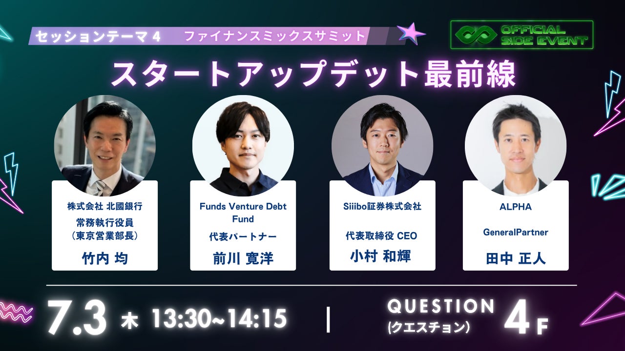 スタートアップが、出資・融資・ベンチャーデット・補助金など、複数の資金調達方法を、それぞれの特性を活かして組み合わせ、成長資金を確保する #ファイナンスミックス をテーマに、スタートアップ・起業家・VC・金融機関・ベンチャーデット・支援者が一堂に会し、つながり、交流し、最新情報に触れるきっかけをご提供いたします。