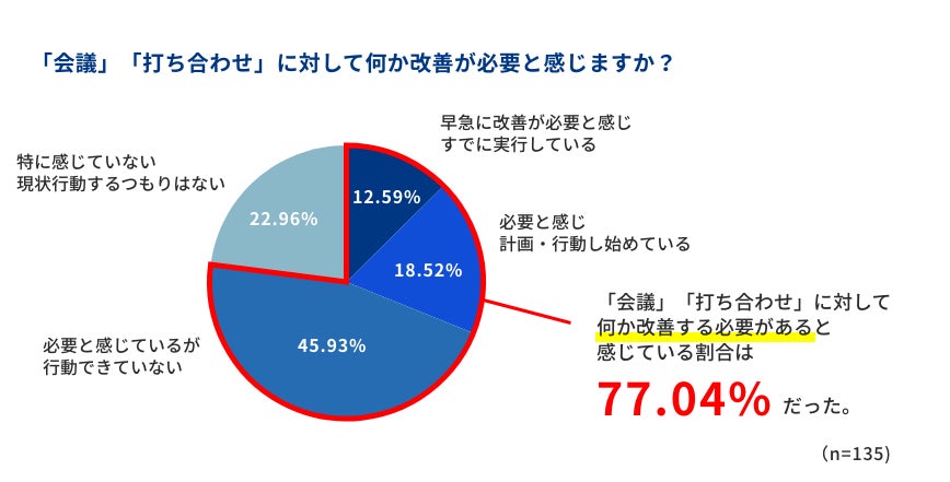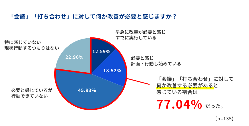 また、「会議」「打ち合わせ」に対して何か改善する必要があると感じている割合としても、77%ほどとなっており大多数のビジネスパーソンが何かしら改善すべきと感じているのがわかります。