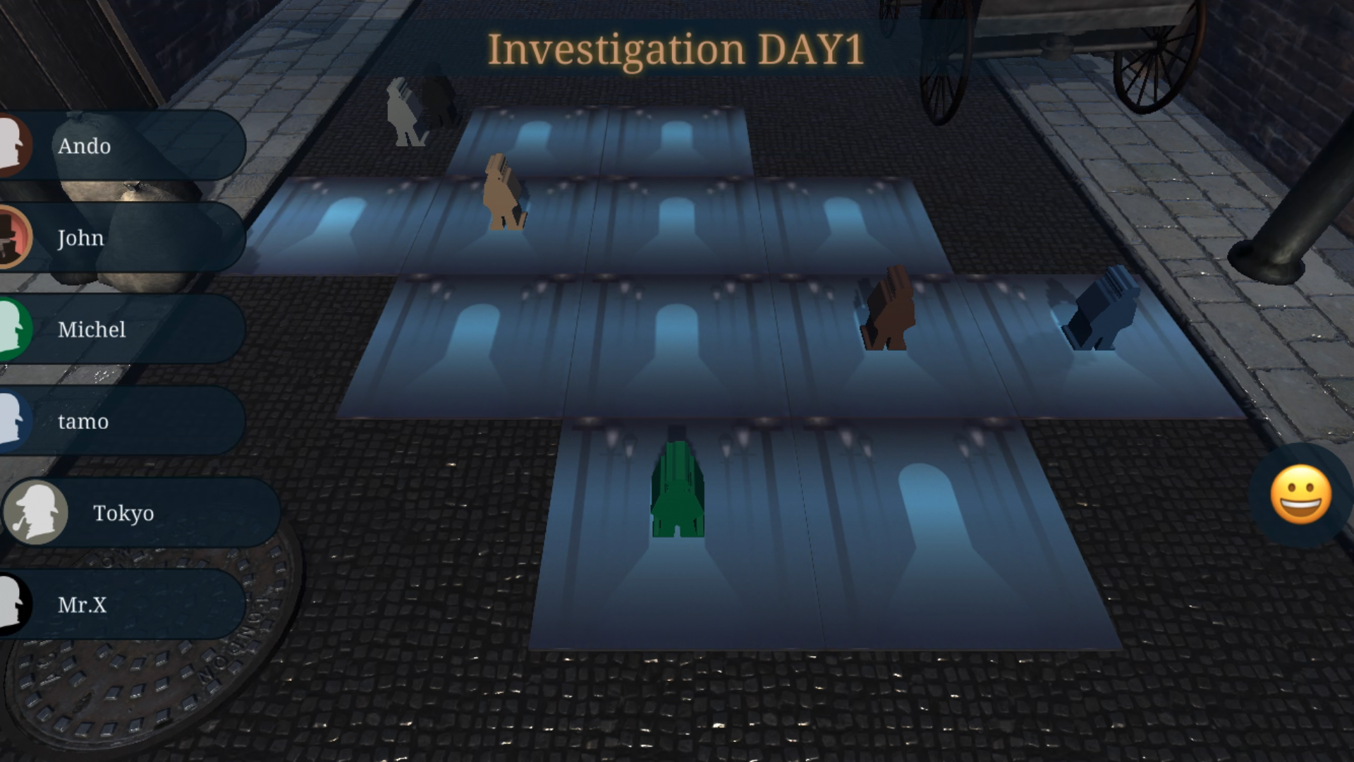 全員が移動すると夜のターンが訪れます。夜のターン、ジャックプレイヤーは自分の隣接するタイルを選択し、そのタイルで殺人を犯します。