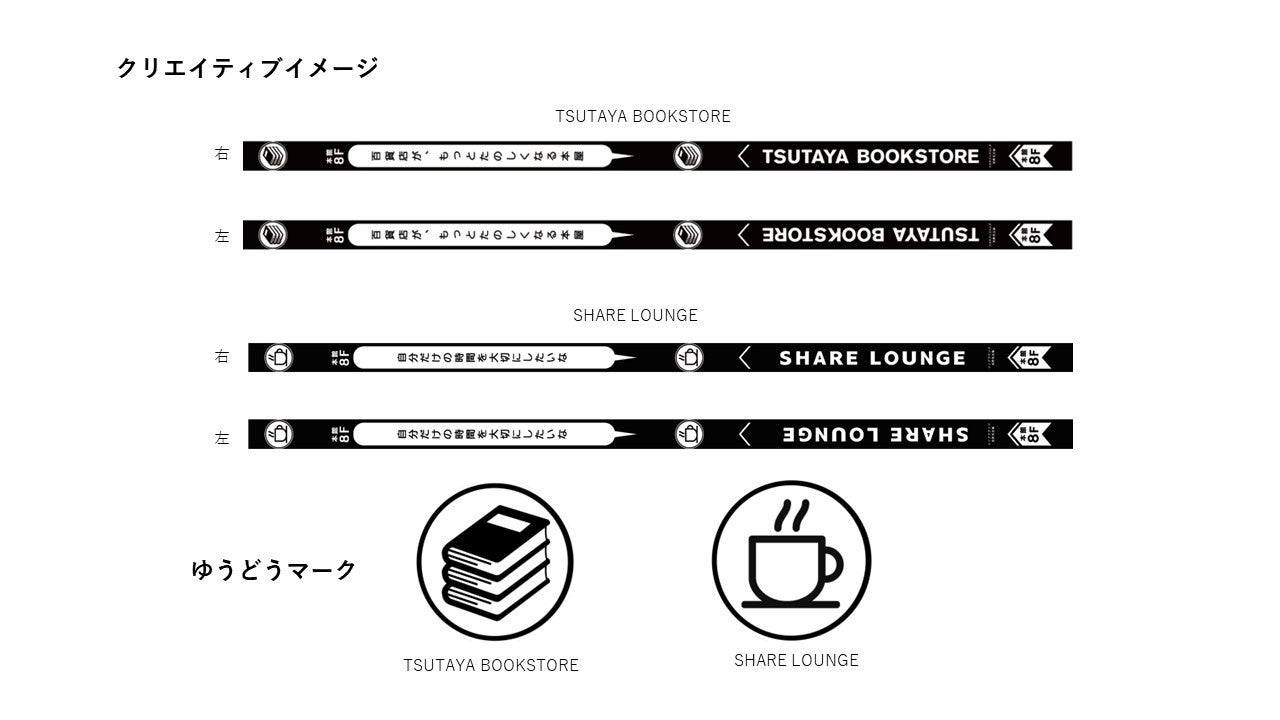 当社では、ユニバーサルデザインの取り組みをより持続的なものにするため、CSR活動の一環としてベルト施工費用を施設収益や広告収益金でまかなうというビジネスモデルを全国で展開しています。名鉄百貨店本店では、ゆうどうマークと共に、本館8階にある「TSUTAYA BOOKSTORE」・「SHARE LOUNGE」の認知を拡大するためのエスカレーターの手すり広告を掲出することで、安全の取り組みを持続的に行うための施設収益確保も同時に目指しています。