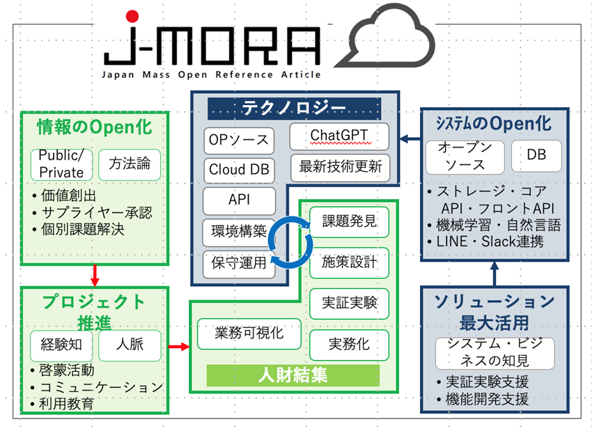 主要活動:月1回プロジェクトメンバーがmusubuAIに集合し、議題に対して集中討議を実施。業界や企業の課題を可視化、テクノロジー勉強会を実施してJ-MORAを活用してその課題(商談をはじめとする業務プロセスの合理化、正確性の向上、ビッグデータの活用)の解決に向け実証実験を繰り返し実施いたしました。