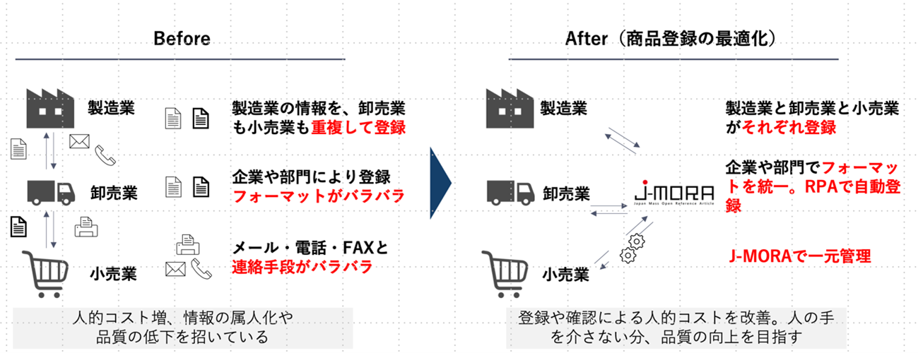 J-MORAをHUBとして製配販による商品マスタの登録活用の共通化の実現を目指します。製造業・卸売業がそれぞれJ-MORAに商品情報を登録、小売業が持つ商品マスタにはRPAを使いシステム内部で自動登録、これによってこれまで重複していた商品登録やバラバラのフォーマットにそれぞれ対応するプロセスをなくします。