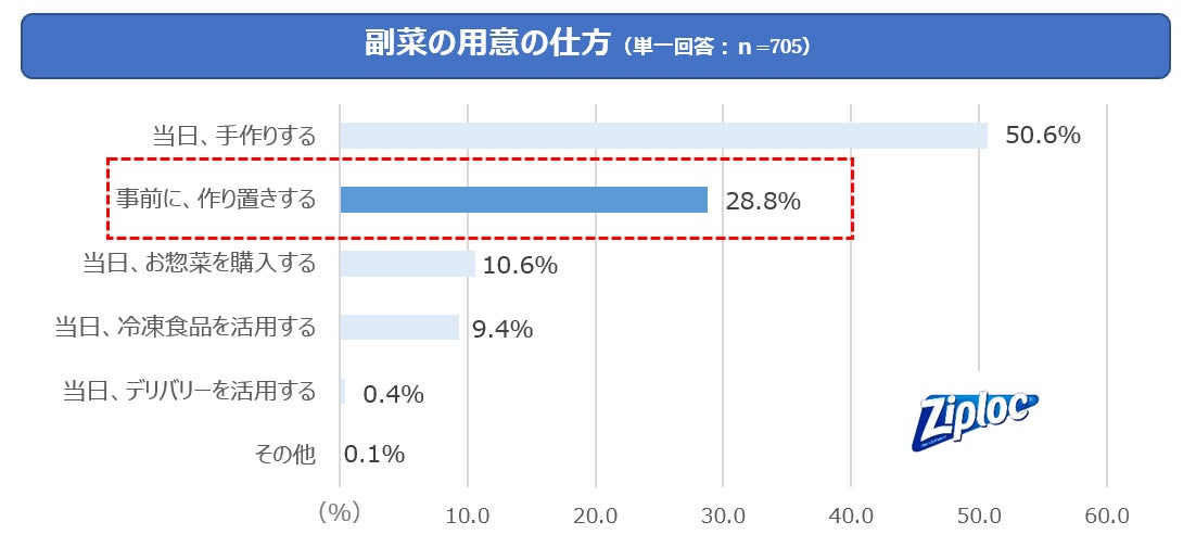 主菜以外の副菜の用意の仕方について聞くと、約3割の人が「作り置き」をしていることがわかりました。