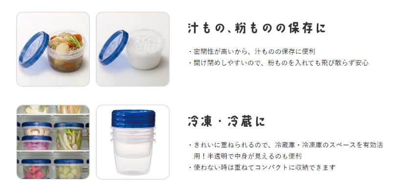 サイズは3種類(300ml、473ml、730ml)を展開。半透明で中身が見やすく、きれいに重ねられるので冷蔵室・冷凍室のスペースを有効活用できます。