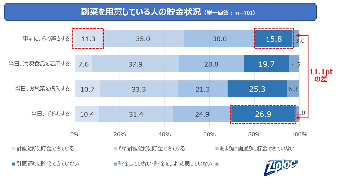また、「事前に、作り置きする」人のうち、「計画通りに貯金できている」と回答した割合は11.3%でした。