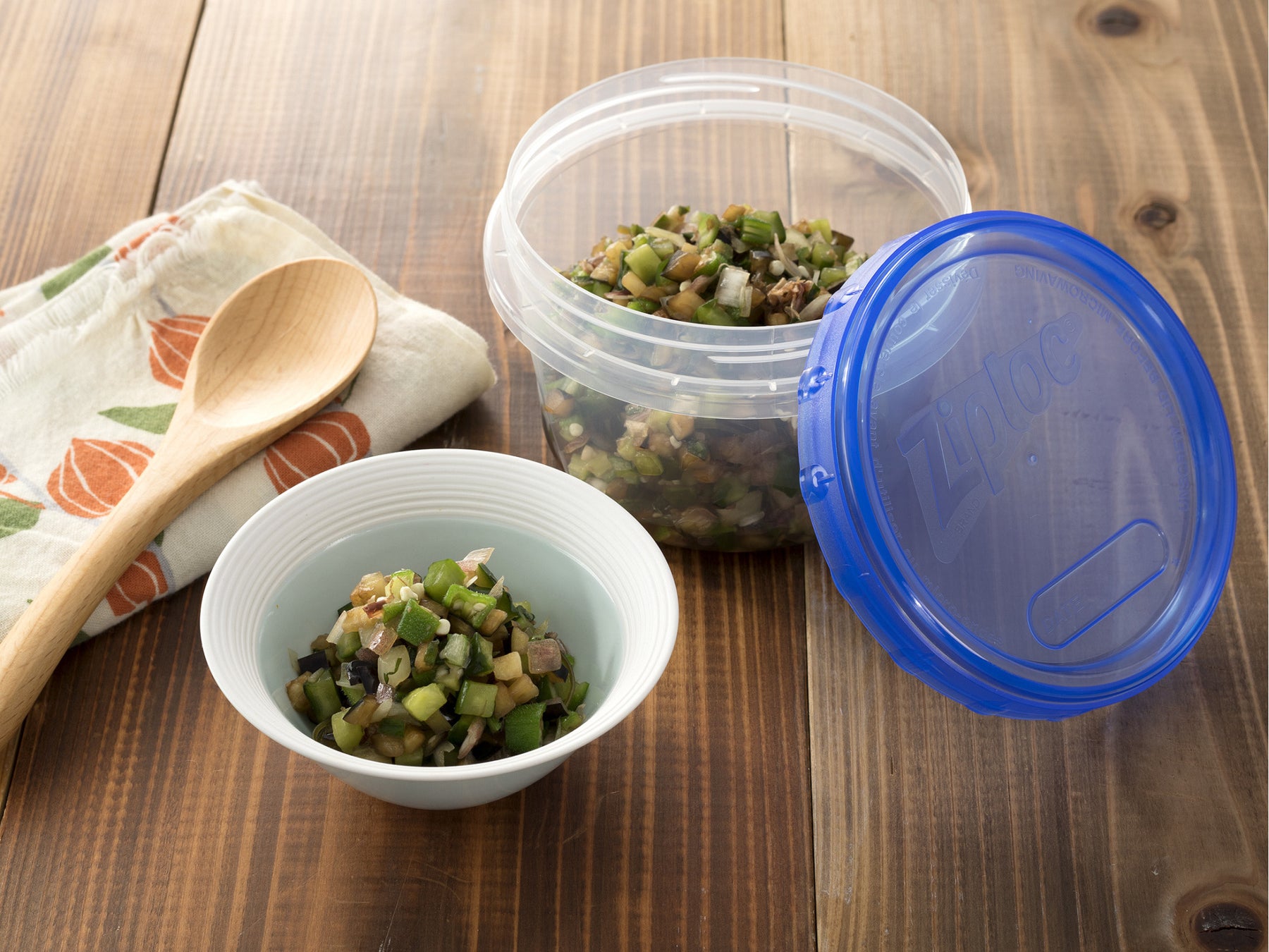 ジップロック®シリーズは約30種類。その中でもジップロック®スクリューロック®はフタがスクリュー式だから、開け閉めが簡単で、汁ものの保存にも便利。