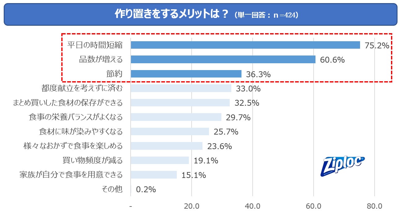 副菜を作り置きするメリットについて聞くと、「平日の時間短縮(75.2%)」、「品数が増える(60.6%)」「節約(36.3%)」があげられました。