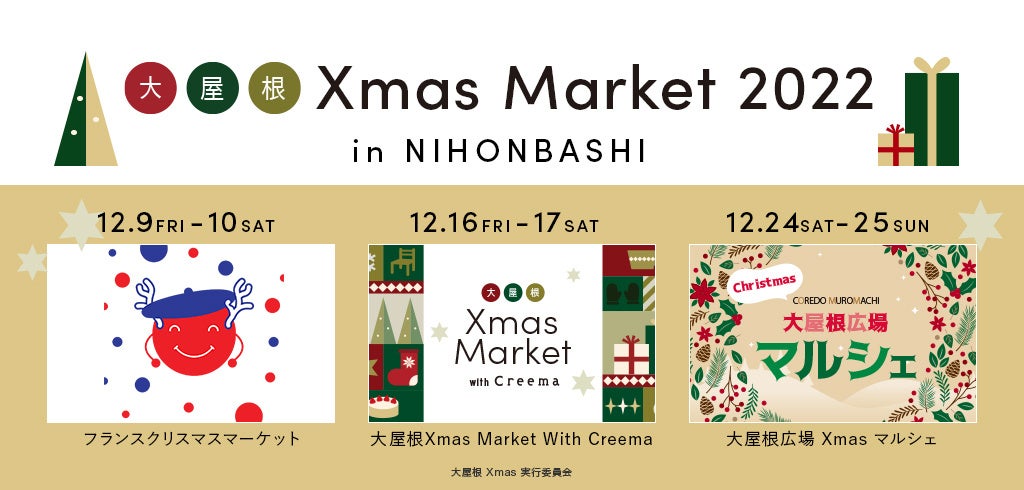 大屋根 Xmas 実行委員会(日本橋室町三井タワー管理組合、一般社団法人日本橋室町エリアマネジメント)は、2022年12月9日(金)から12月25日(日)の期間、イルミネーションの開催に合わせてクリスマスマーケット「大屋根 Xmas Market 2022 in NIHONBASHI」をコレド室町テラス 大屋根広場にて開催します 。各週末ごとに違った趣向を凝らして開催される3つのクリスマスマーケットは、日本橋ならではのクリスマス気分を味わえる憩いの空間を演出します 。