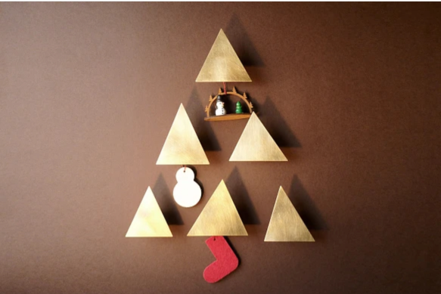 三角の真鍮板にオーナメントをぶら下げる壁取り付け型のクリスマスツリー。このほかにも、金属(真鍮)商品の販売を予定。