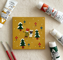 手のひらサイズのキャンバスに描いた原画、手描きで絵付けしたクリスマスオーナメントやフラワーベース、トートバッグなどを販売予定。