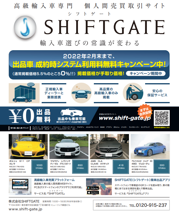 ご好評いただいております高級輸入車の個人間売買サイト「SHIFTGATE」では、ご愛顧いただいております出品者様への感謝の気持ちを込めて、通常成約時にご請求させていただくシステム利用料(車両価格の5.5%税込み)を本年12月1日より来年2月末までに成約いただいた場合は無料とさせていただいております。
