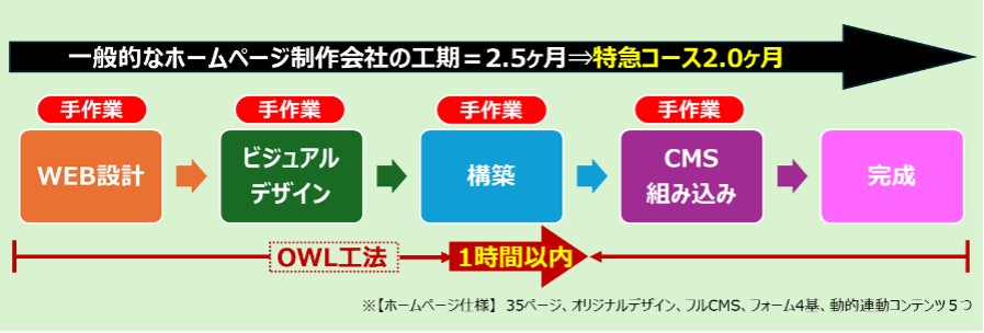 このOWL(アウル)工法は、【WEB設計⇒ビジュアルデザイン⇒構築⇒CMS組込み】までのWEB制作の工程を、意図を持って「自動化」させ、一般的には2ヶ月ほどかかっている工程を、わずか1時間以内で完了させるホームページ生産工法です。