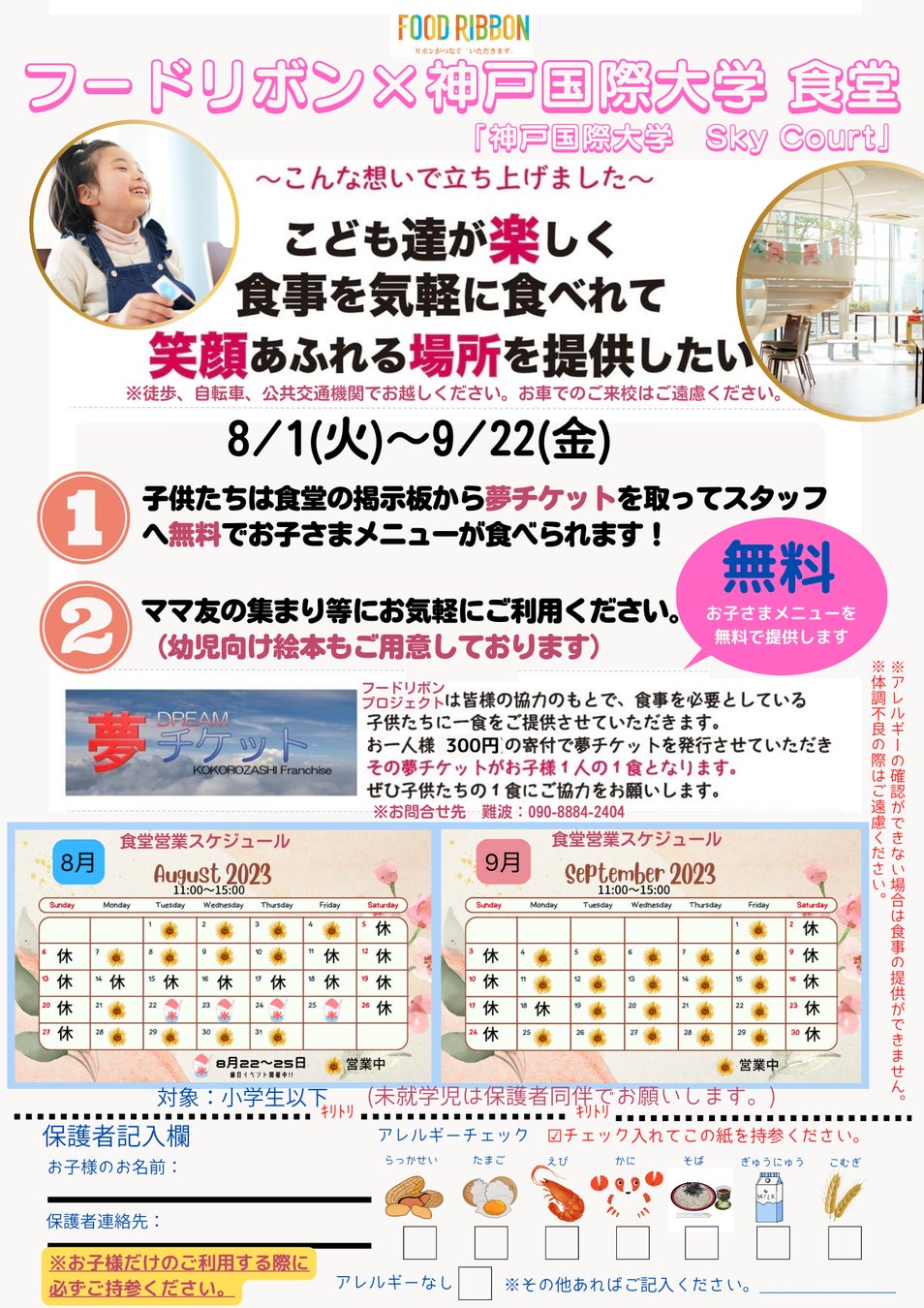株式会社ORIENTALFOODS(以下当社)は、夏季休暇中の神戸国際大学の食堂 Sky Court(スカイコート)を舞台に「日本一学べる、日本一つながる、日本一体験できる」夢食堂(こども食堂)を実施いたします。このプロジェクトは神戸市の実施する「令和5年度CO+CREATION KOBE Project(WISH型)」に選定されました。