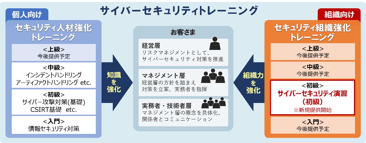 このたび、インシデント対応能力を個人と組織の両面から強化することを目的に、「サイバーセキュリティトレーニング」を再編し、既存コースを個人の知識・技術を強化する「セキュリティ人材強化トレーニング」と位置づけるとともに、新たに組織のインシデント対応能力を強化する「セキュリティ組織強化トレーニング」を追加しました。