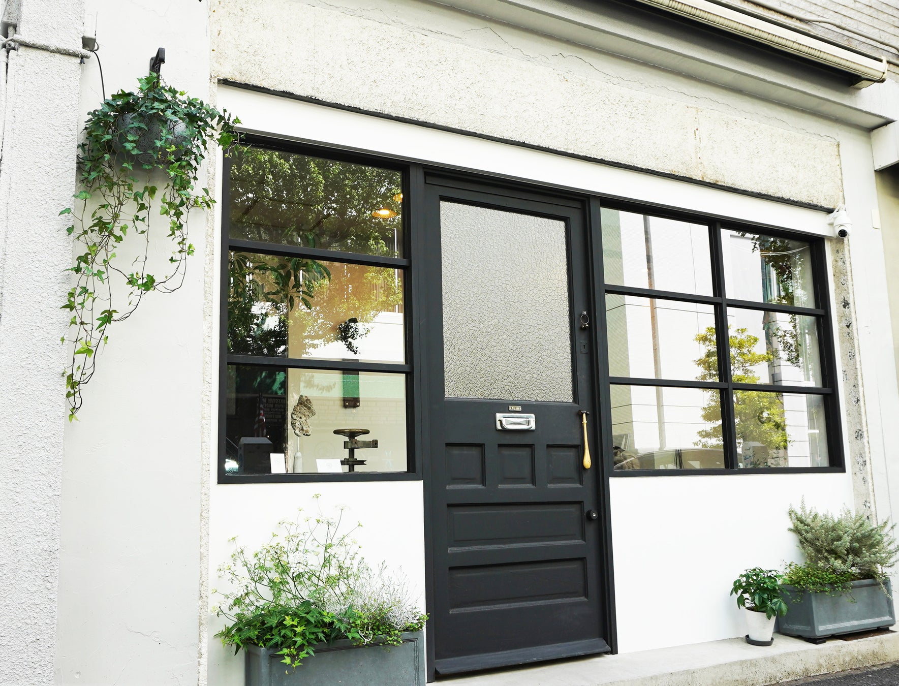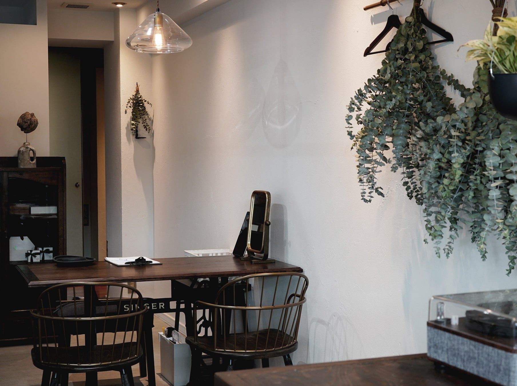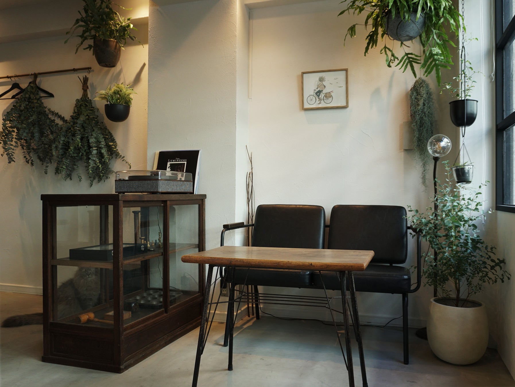 お客様をご案内するスペースは落ち着いた隠れ家のようなプライベート空間で、ゆっくりとお過ごしいただけます。アンティーク家具とたくさんの植物、作家物の器やオブジェに囲まれたインテリアは、オーナー夫妻のこだわりが詰まっています。