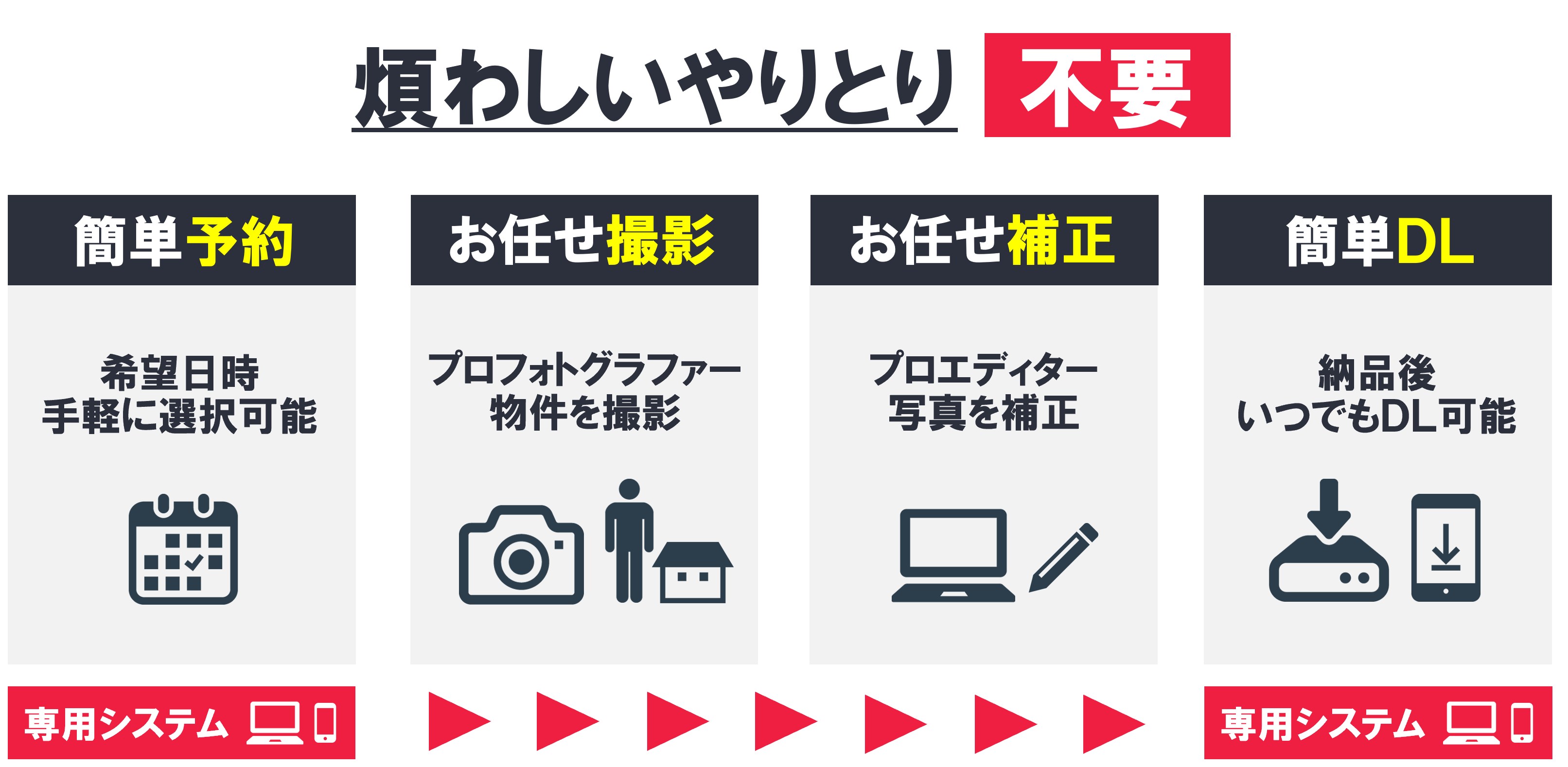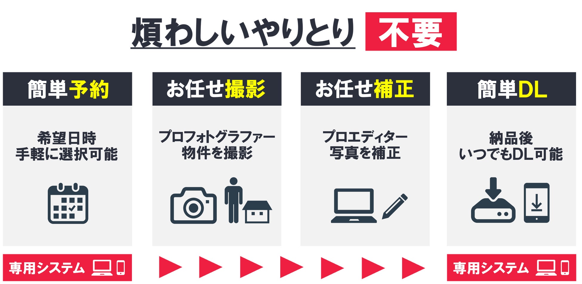 対応可否がエリア毎に別れる他社撮影サービスもある為、一本化によって管理が容易になります。