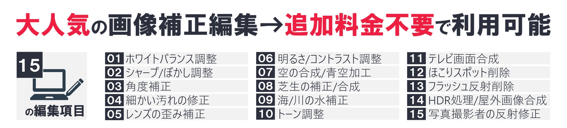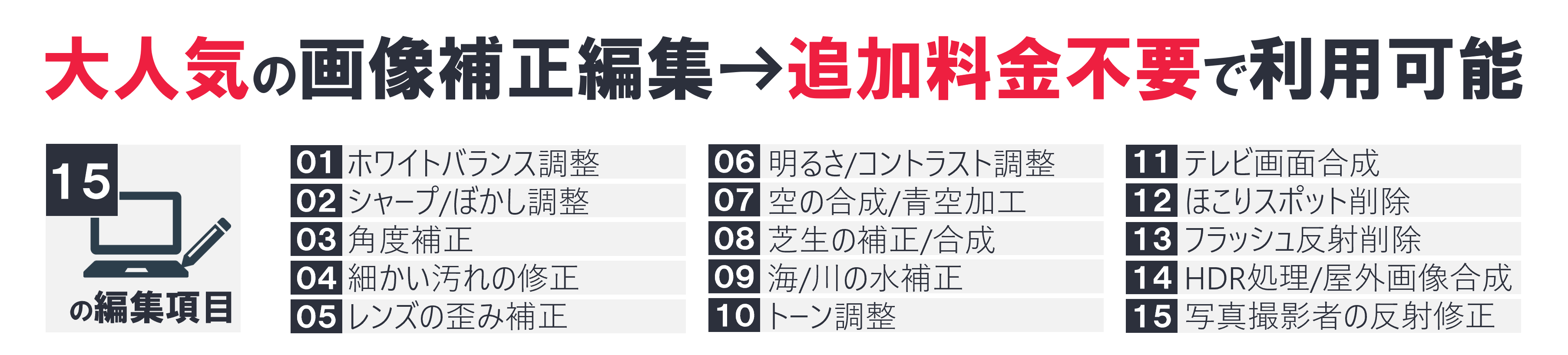 編集代、遠方エリアなど他社サービスでは追加料金が発生するサービスも追加料金なくご利用いただけます。
