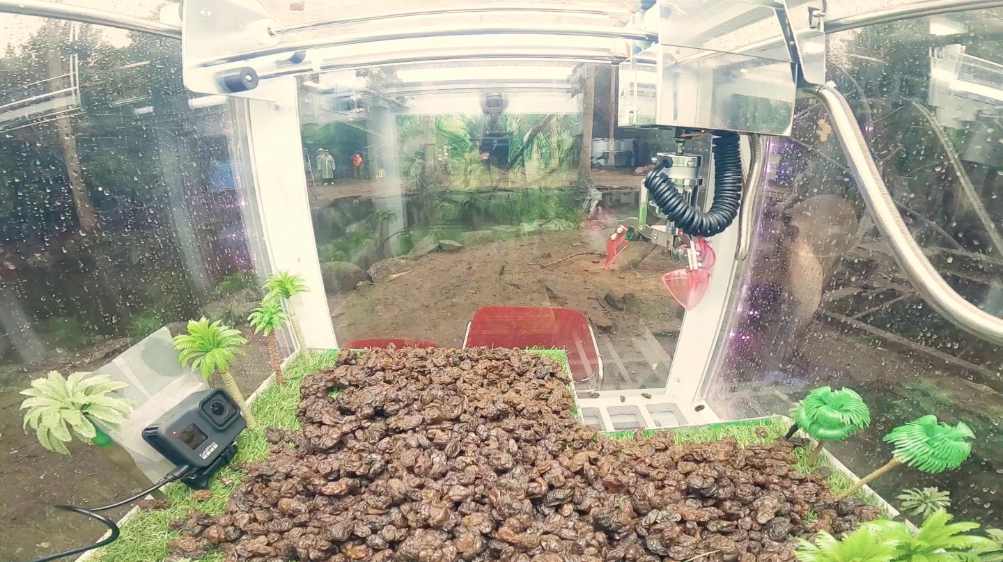 長崎バイオパークで、オマキザルにエサやりといえば「レーズン」。普段は、猿島に向かってレーズンを投げるとお猿さんたちは喜んで取ってくれる。そこで、今回の景品では、そのレーズンを大量に用意した。クレーンゲームを縄張りの猿島におくと、すぐにレーズンを認識。どうにかして、とりたい様子が見てとれました。